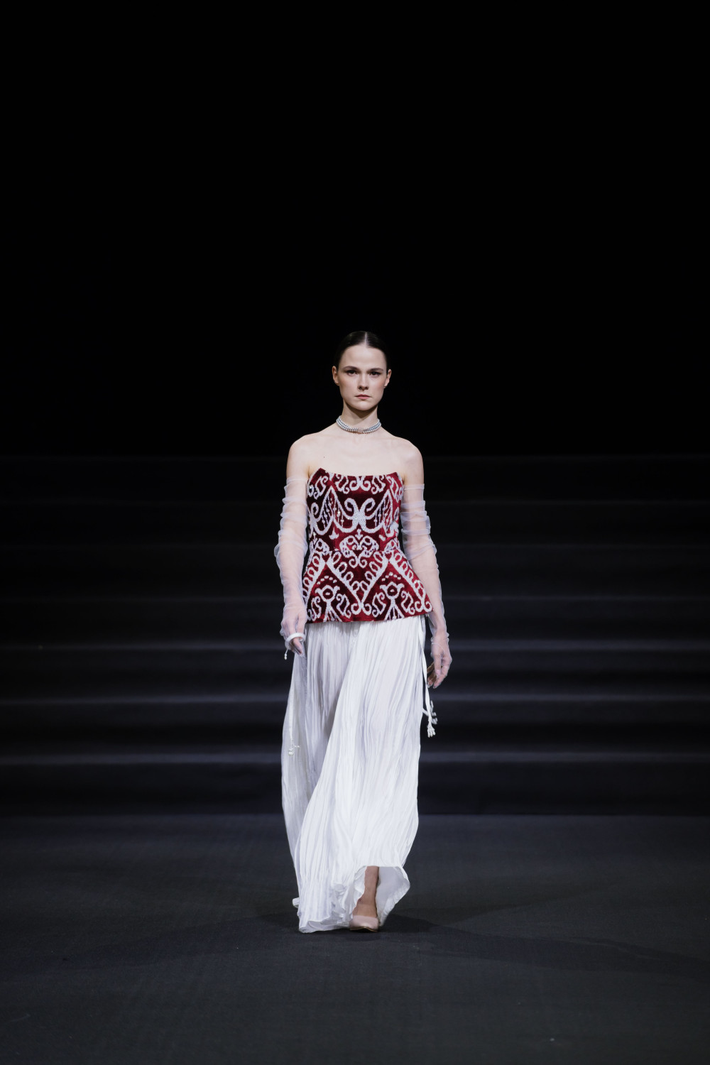 Это была не просто одежда. Это был сон — сон, в котором оживали родовые узоры, звучали голоса бабушек, тихо звенели украшения из сундука памяти. Корсет — символ внутренней собранности и опоры. Кимоно-жакеты — жест открытости и мягкой силы. А белые юбки — финальный аккорд этих образов. Они не просили внимания, не стремились быть заметными. Они просто были — как утренний свет, неслышно скользящий по плитке забытого дворца. В их движении — тишина, в тишине — сила, а в этой силе — абсолютная женственность.