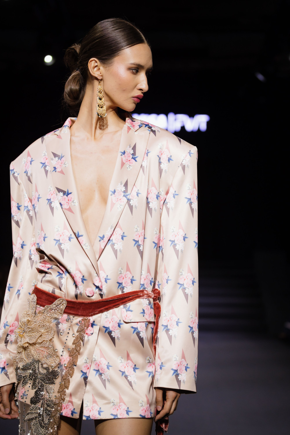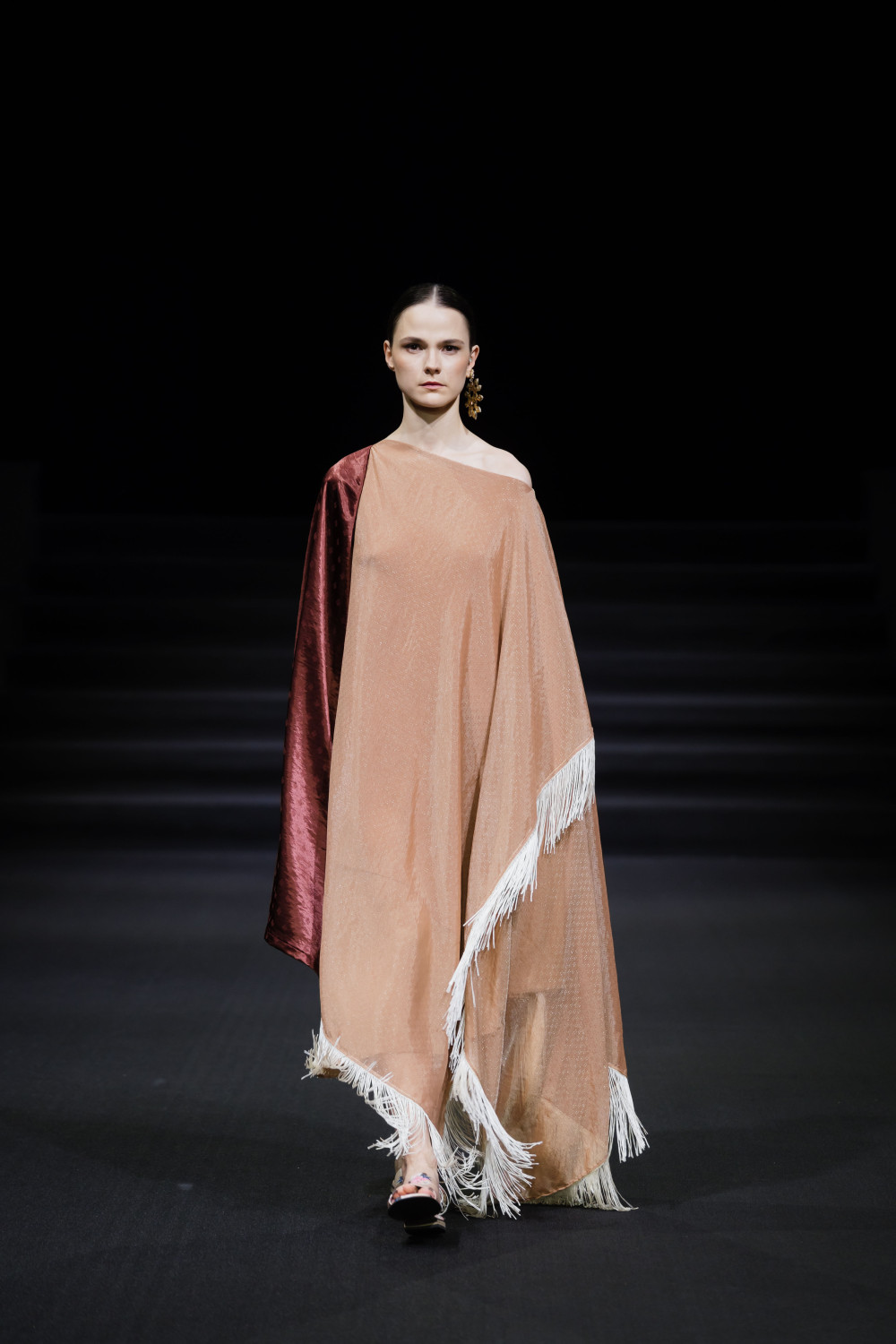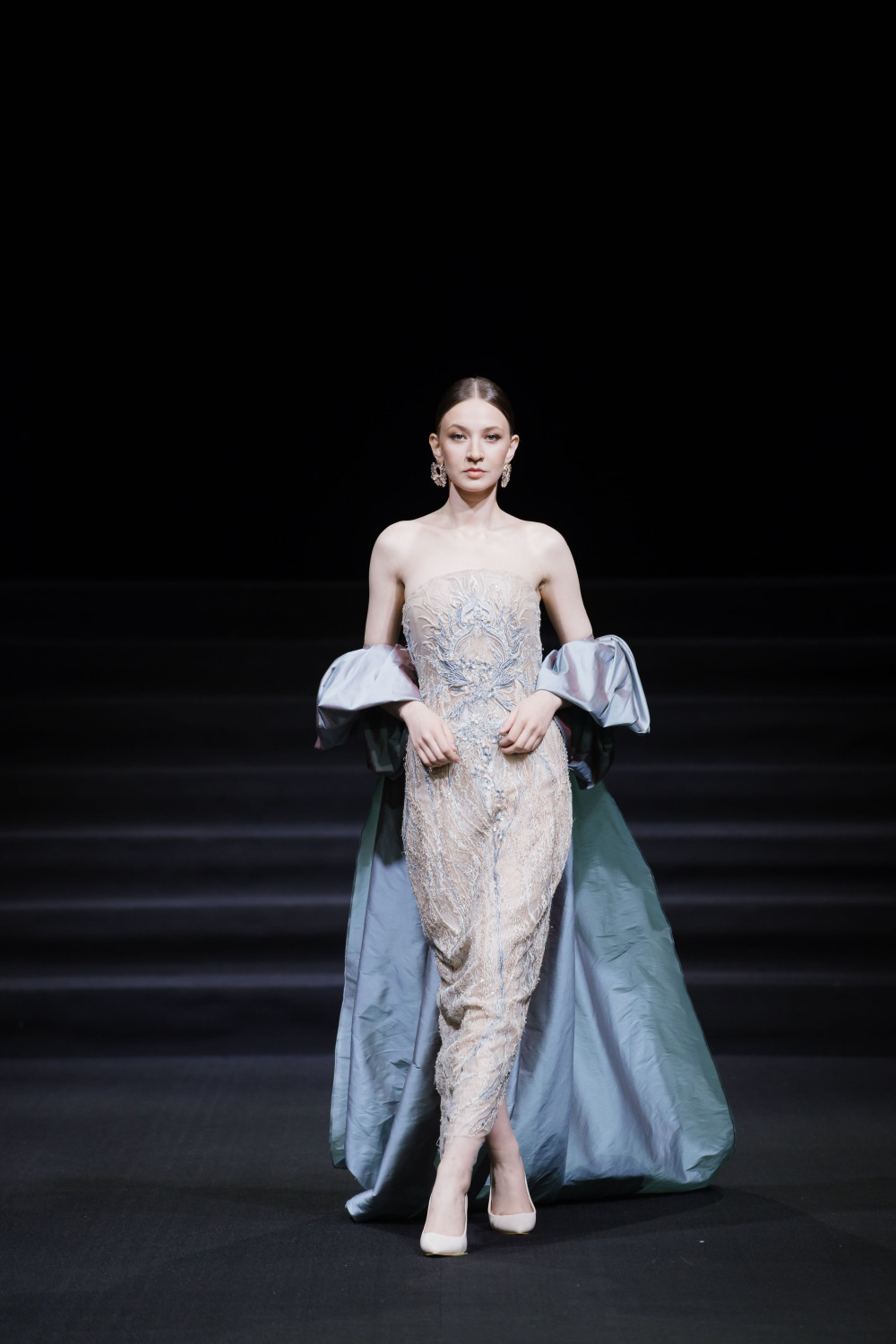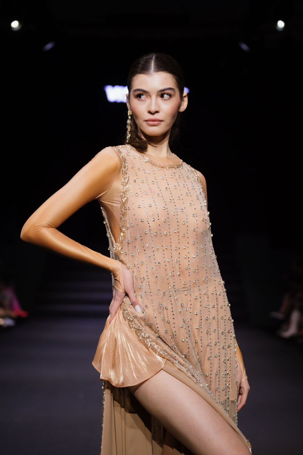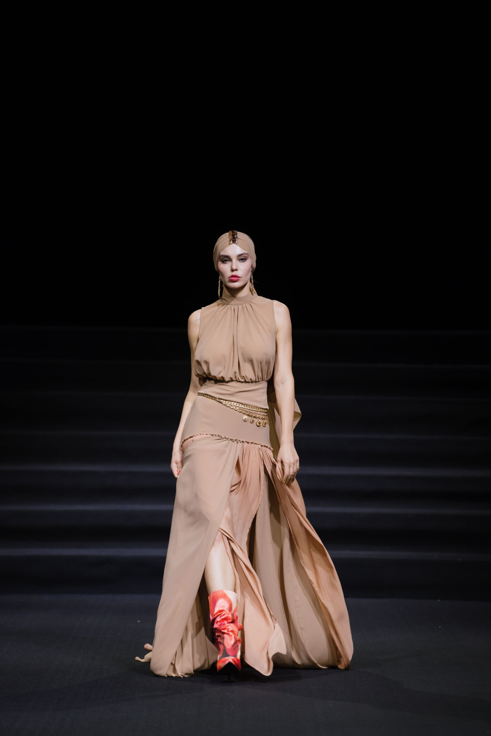 Показ развивался как тщательно выстроенная партитура: от нюдовых тонов и прозрачных тканей, струящихся по телу, до бархатных фактур, восточной инкрустации и бликов золота. Принты на жакетах казались перенесенными с полотен художника, тюрбаны обрамляли лицо с аристократической мягкостью, а кристаллы на полупрозрачных платьях сверкали, как дождь, пойманный в солнечном луче.