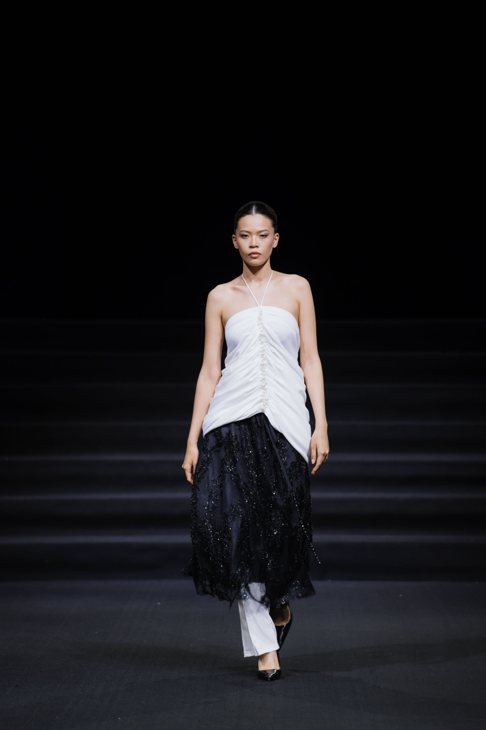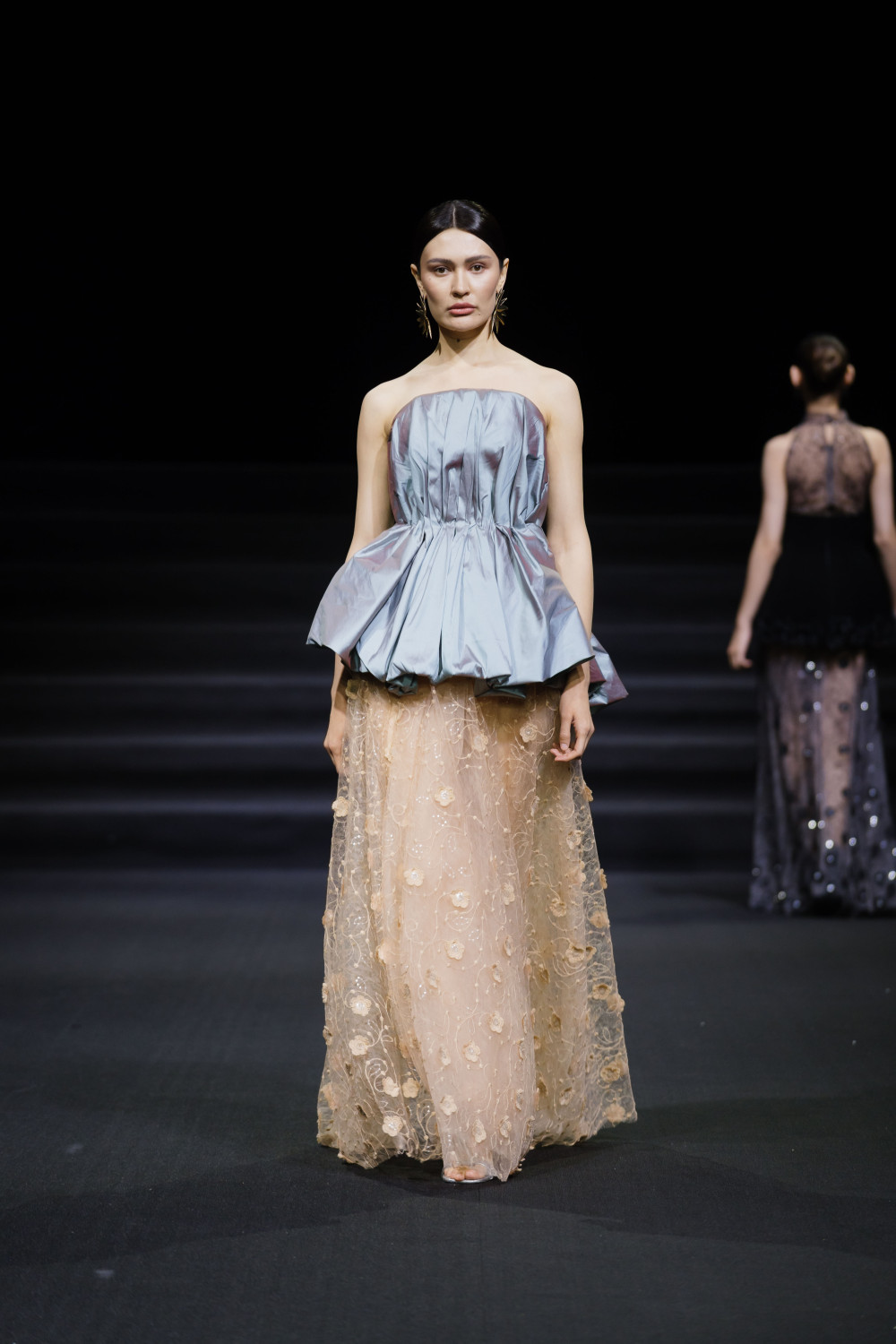 Показ открылся платьем цвета топленого молока — нежного, как утро в конце мая. По телу струились ветви жемчужной вышивки, будто солнечные нити на рассвете. Атласные рукава-накидки цвета морской пены плавно спадали с плеч — как прикосновение теплого ветра. А следом — архитектуре контрастов: прозрачность и плотность, структура и текучесть, матовые ткани и светящиеся акценты. Эта игра противоположностей не спорила, а складывалась в гармоничную целостность — ту, что невозможно скопировать, можно лишь почувствовать.