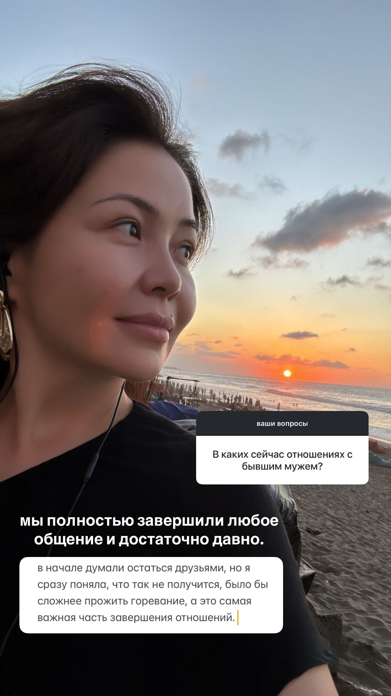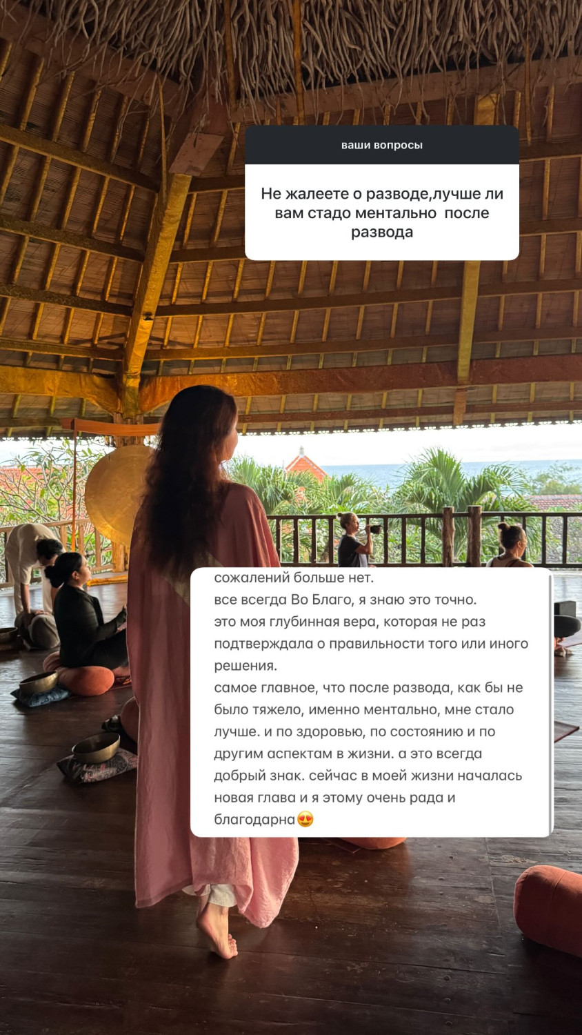 «Өкініш деген қазір жоқ. Барлығы әрдайым жақсылыққа деп білемін. Бұған сенімім нық. Өмірде талай рет дұрыс шешім қабылдағанымды осы сенімім дәлелдеген. Ең бастысы, ажырасқаннан кейін қаншалықты қиын болса да, ең алдымен, менталды тұрғыдан жеңілдедім. Денсаулығым да жақсарды, көңіл-күйім де орнықты, өмірдің басқа да салаларында оң өзгерістер болды. Бұл – әрдайым жақсы белгі. Қазір өмірімде жаңа тарау басталды. Мен соған өте қуаныштымын»,