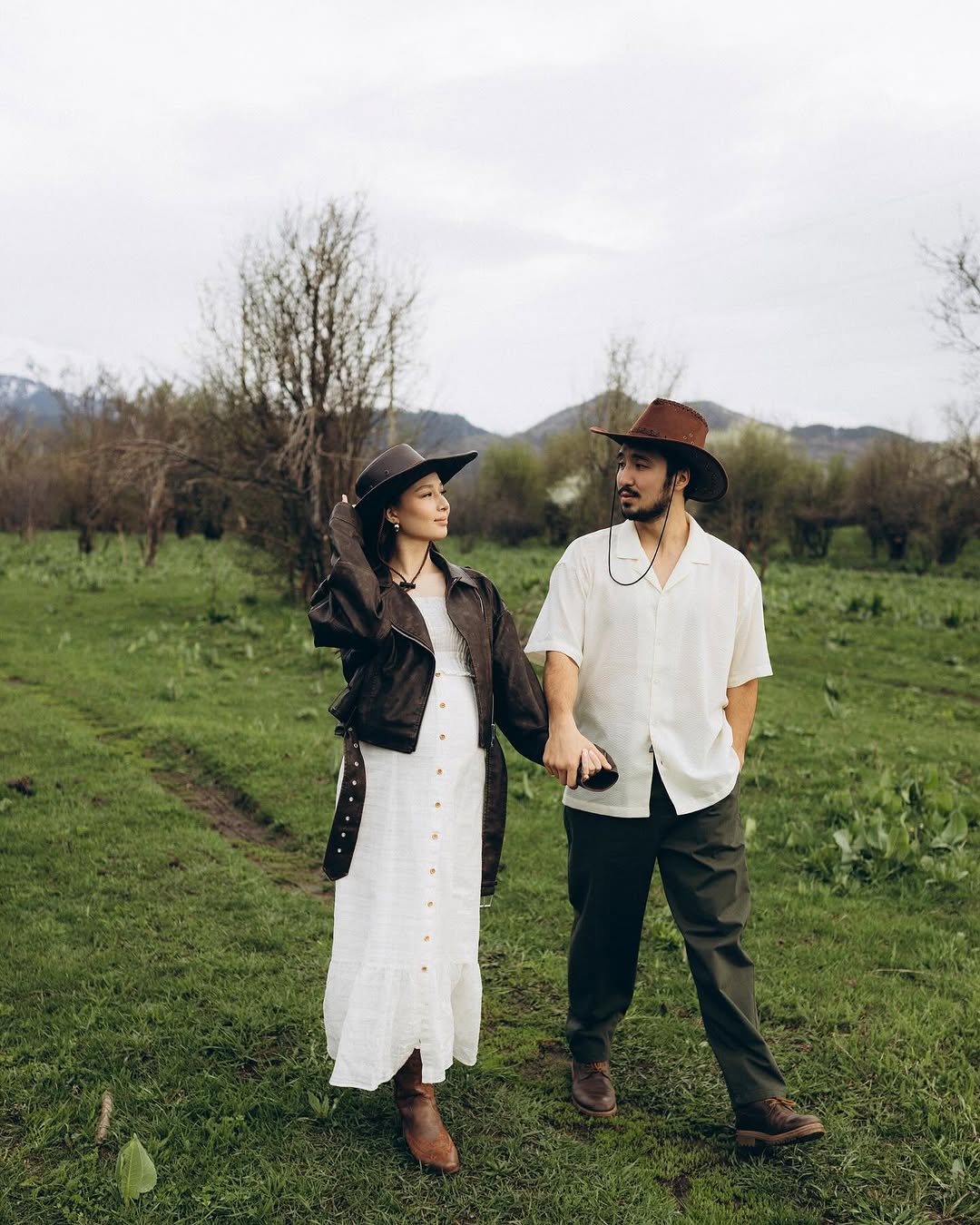 Фототүсірілім табиғат аясында өтті, жас жұбайлар ковбой стилінде киінді. Екеуінде де қалпақ, ал жары былғары күртешеде болды.