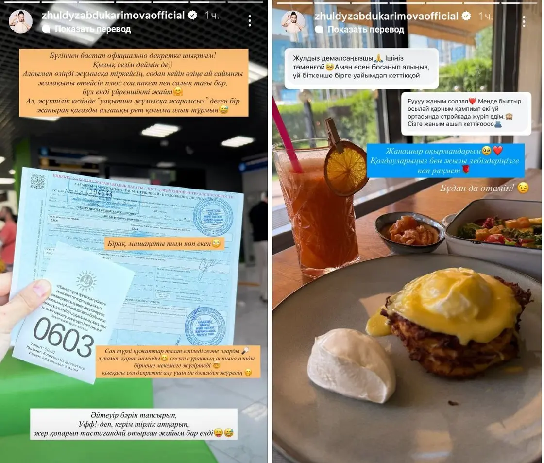 «Бүгіннен бастап ресми түрде декретке шықтым. Қызық сезім… Уақытша еңбекке жарамсыз деген бір жапырақ қағазды алғаш рет қолыма алып тұрмын»,