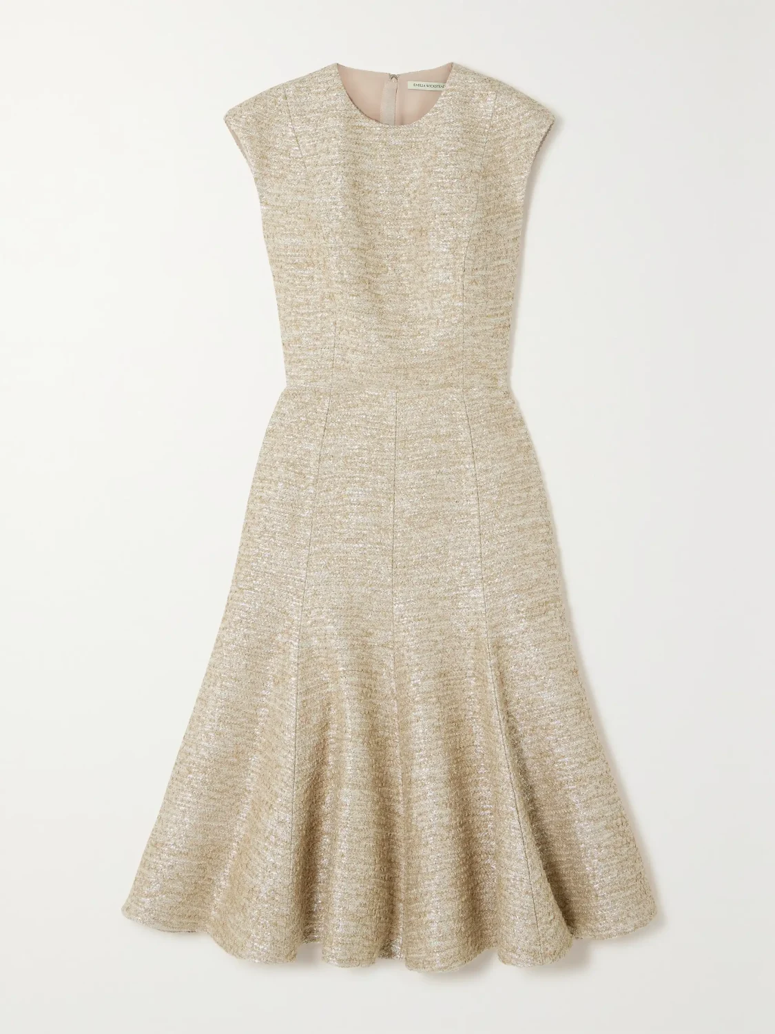 Шарлотта Йорк во втором эпизоде по-прежнему остается иконой элегантности — и на этот раз она делает ставку на сдержанность. Для сцены, где они с Лизой обсуждают успеваемость своих детей, она выбирает структурированное миди-платье из металлизированного твида от Emilia Wickstead.