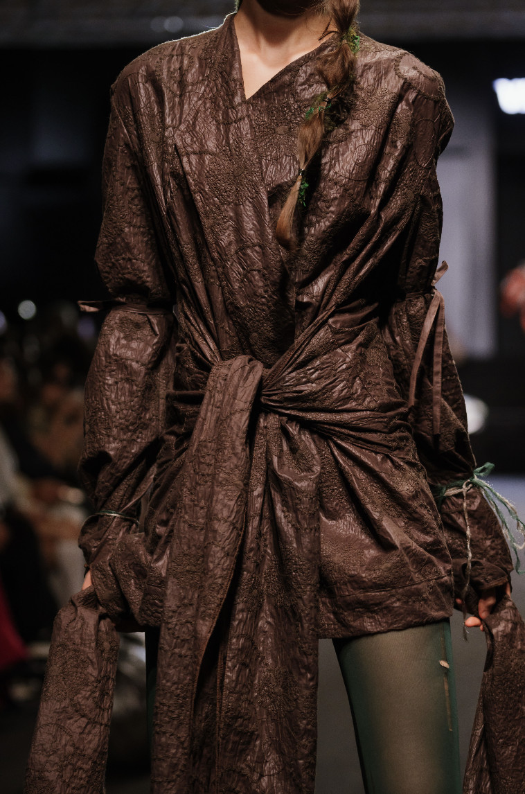 Самое сильное — это не громкость коллекции, а ее молчание. Ни одного прямого лозунга. Ни одной фразы на спине. Только правда, сказанная без слов. Серебристый зонт, который держит модель, — не защита, а символ бессилия. Юбка, будто собранная из вещей, забытых и выброшенных на свалке, — не фантазия, а отражение той самой реальности, в которой мы уже обосновались.