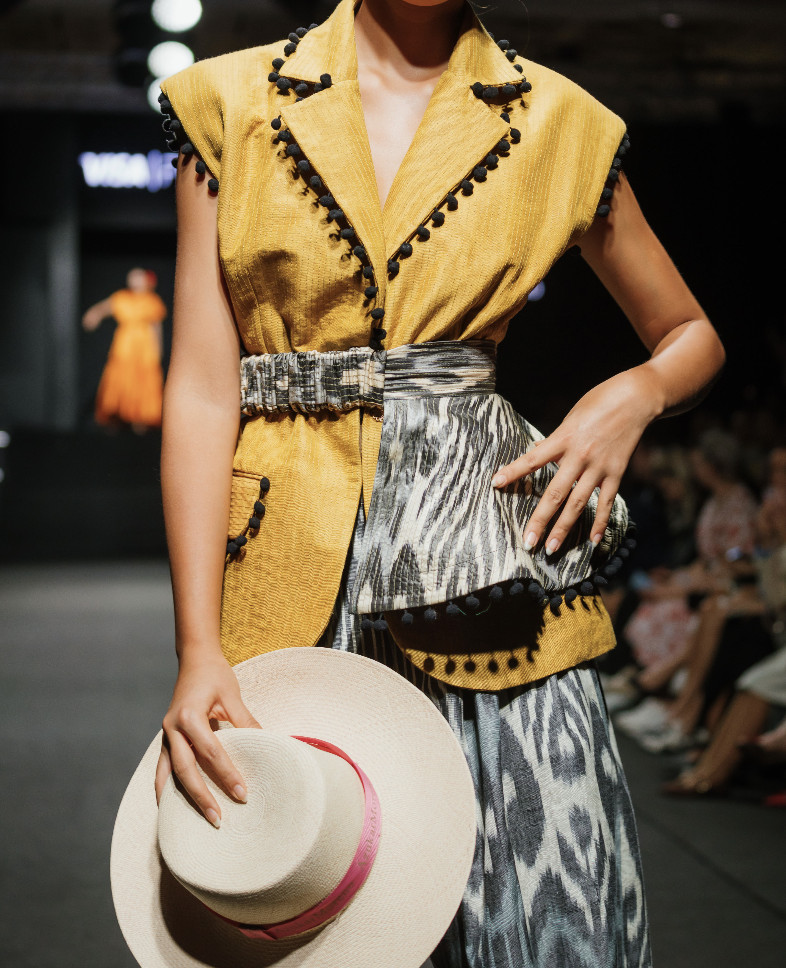 Именно здесь, на перекрестке двух культур, рождается форма. Платья с испанским темпераментом — с волнами фламенко в каждой складке — встречаются с восточной плавностью, с ее текучими линиями, вниманием к телу, к движению, к дыханию ткани. Но суть — не только в крое, но и в материи. Икат, адрас, бахмали, шелк — здесь они звучат, как «мелодия души». Сотканные вручную, они впитывают в себя не только мастерство, но и память. Память о местах. О людях. О пальцах, что раз за разом пропускали нити через станок, вкладывая в ткань не просто узор, а ритм живой культуры.