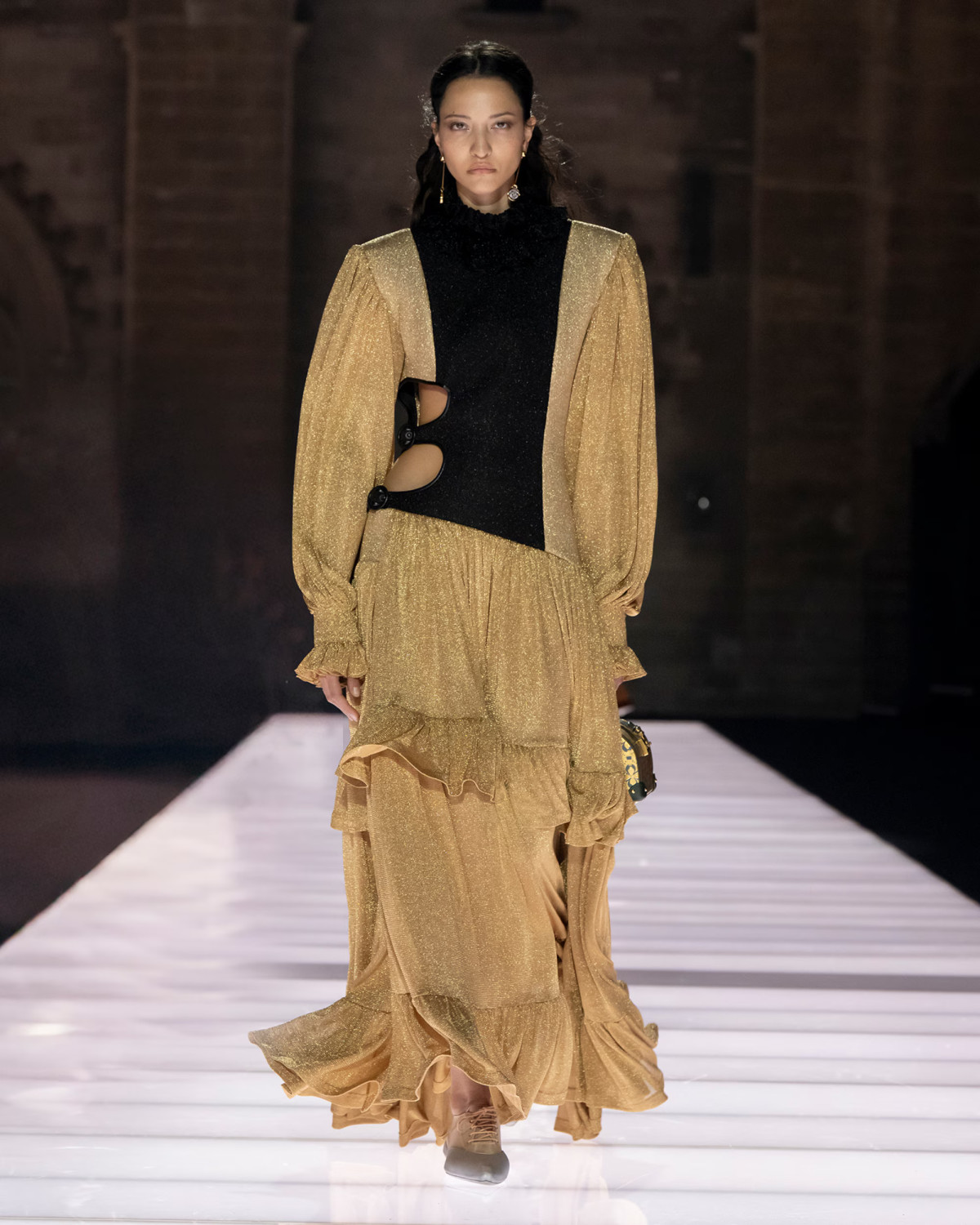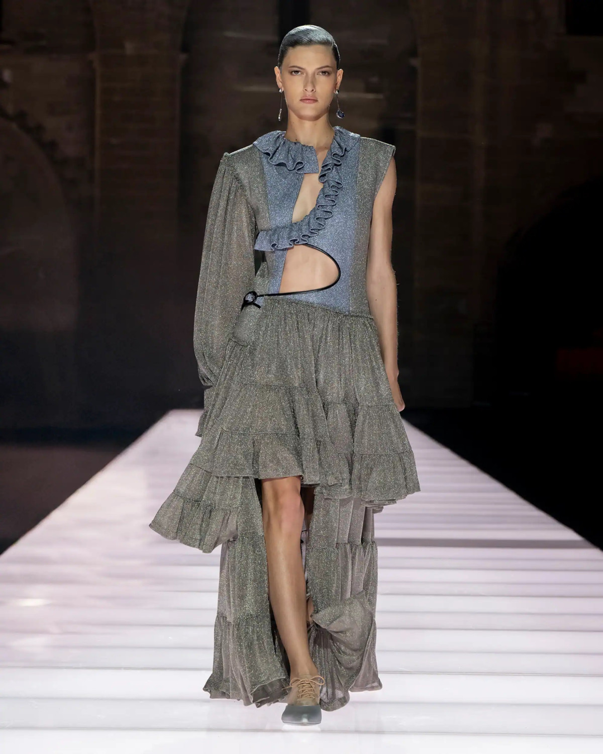 Открыла шоу Джулия Нобис — в сверкающей кольчужной тунике, напоминающей рыцарский мундир, и небрежно наброшенном плаще. Будто она только что спасла мир — и опаздывает на концерт. В этом и заключался главный месседж Жескьера: «Да, я смотрю в прошлое. Но я не реконструктор. Я рассказываю новые истории». За ней — металлизированные платья, отсылающие к Жанне д'Арк, юбки-цветы, застывшие в движении, и кейпы с викторианским привкусом.