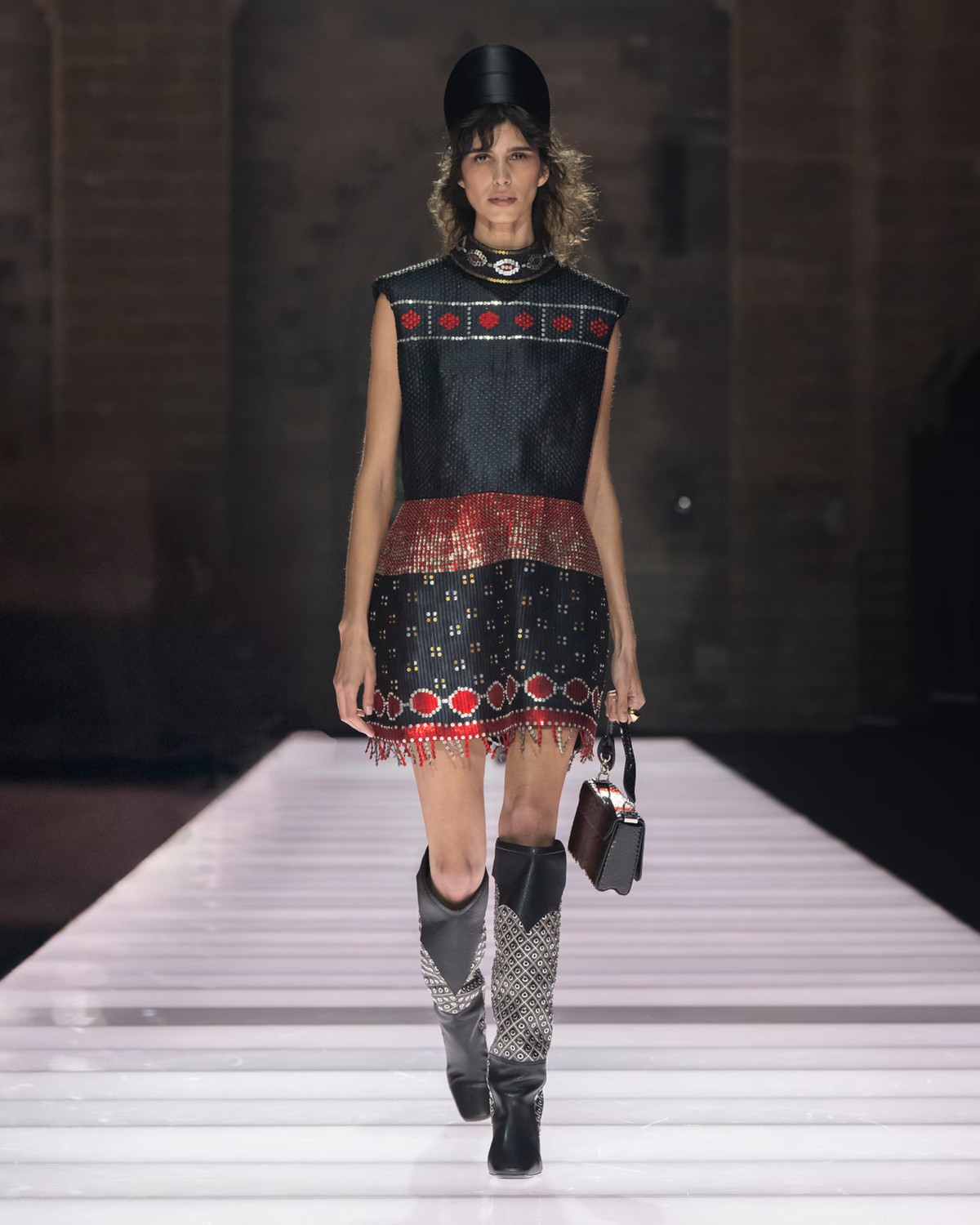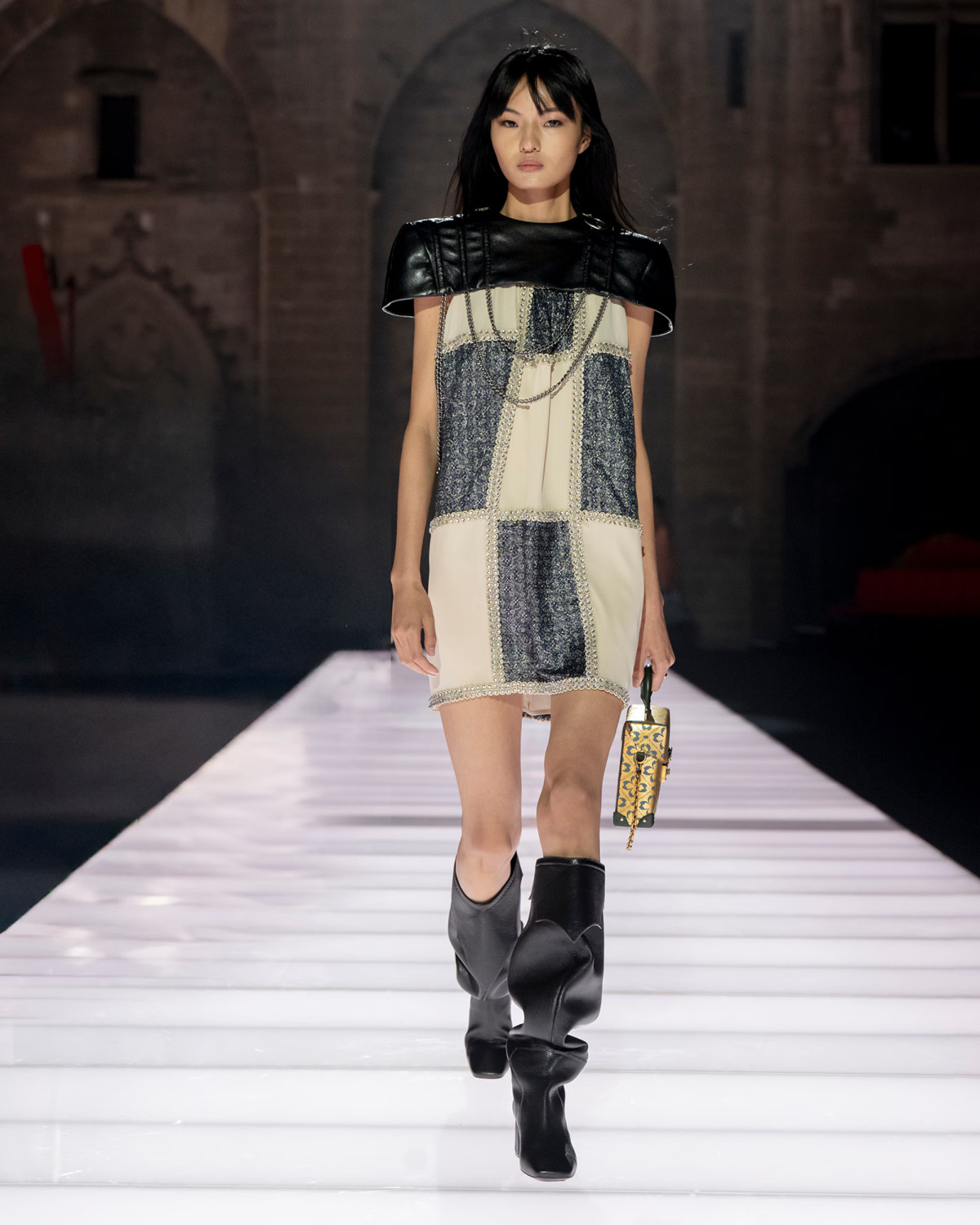 Показ сопровождался звуковой симфонией: ржание лошадей, шорох крыльев, зловещие хоры — словно из фильма о ведьмах. Но этот саундтрек был не столько про атмосферу, сколько про внутренний мир героини. Она — не принцесса в беде, а воительница на каблуках, вооруженная ремнем, кожаной курткой и фуксиевой мини-юбкой. Та, кто может цитировать рыцарские легенды и играть в Final Fantasy, быть одновременно геймером, актрисой, святой — и просто собой.