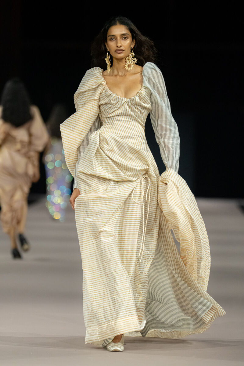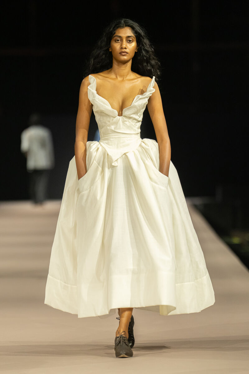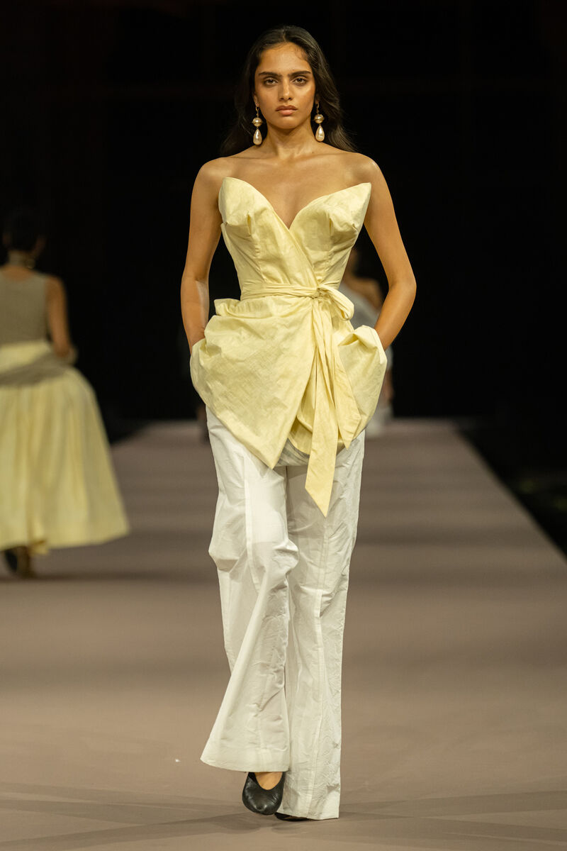 Звезды Болливуда и ведущие фигуры мировой моды собрались здесь, чтобы увидеть, как традиции и современные тренды переплетаются в живом потоке. Коллекция Кронталера стала истинным трибьютом индийскому текстильному искусству. Модели дефилировали в нарядах, сотканных из древнейших тканей — воздушного шелка Чандери и грубого, но благородного Хади. Их предоставили фабрики Khadi India и Aaranya, которые с любовью и уважением к своим корням создают материалы, являющиеся частичкой культурного наследия Индии.