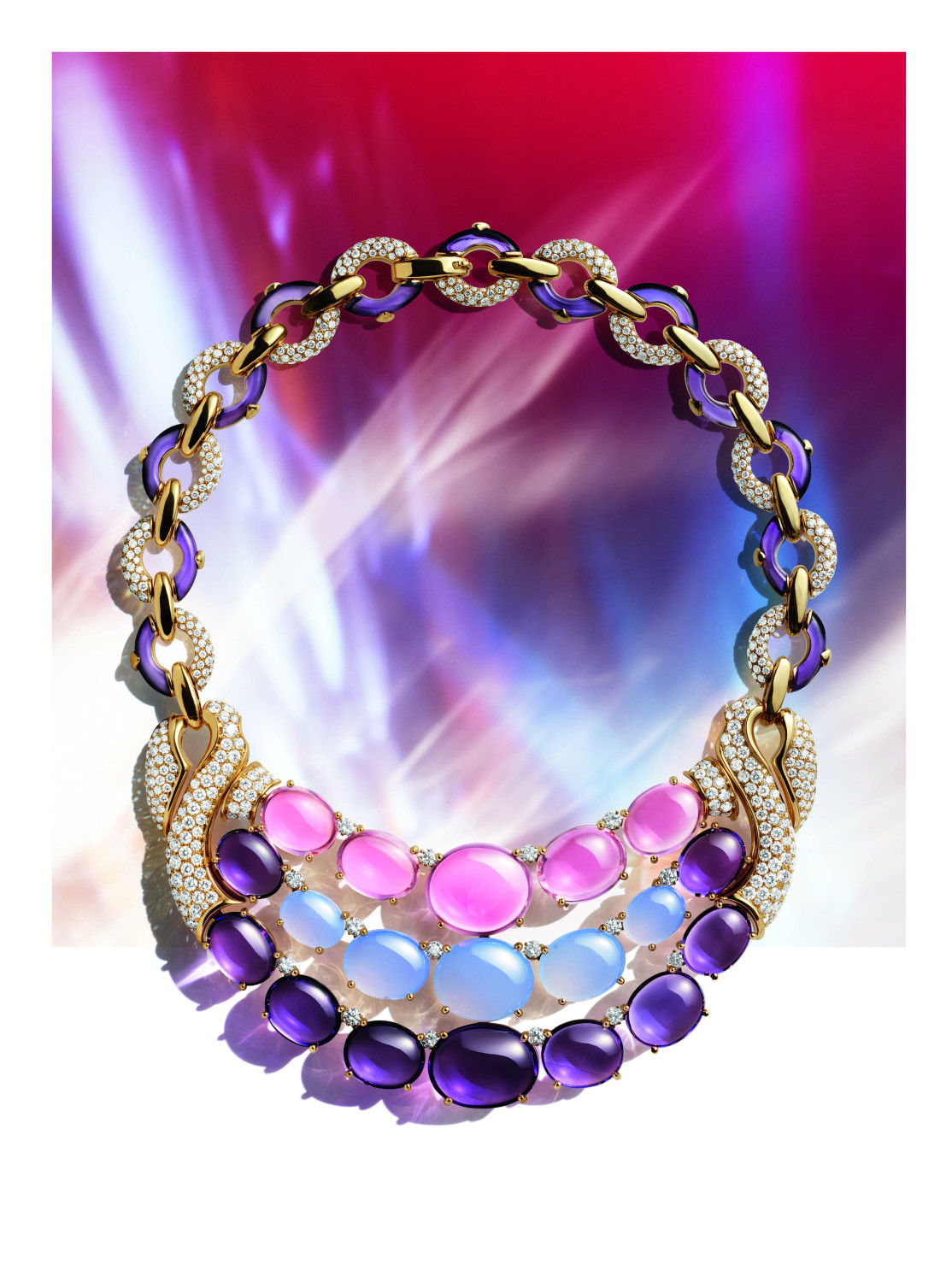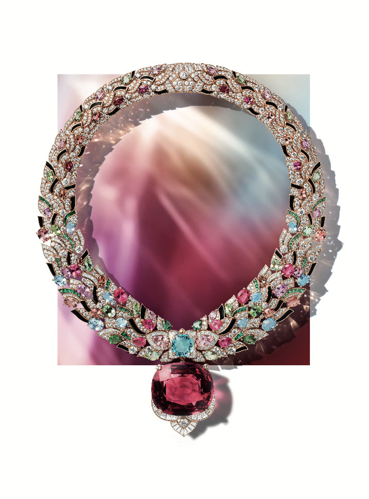 Одним из самых эмоциональных моментов коллекции для нашей редакции стало колье Polychromatic Bloom — роскошная феерия цвета и женственности. Трио из рубеллита (106,36 карат), перидота (55,52 карат) и танзанита (55,11 карат) словно сошло со страниц детской сказки о цветочном королевстве, но выполнено с высочайшей техникой и графичной современностью, которой славится Дом. Оправленные в розовое золото, эти драгоценные камни с их необычайной прозрачностью и глубиной текучего цвета окружены лепестками, чья классическая прелесть уравновешена поразительной современностью графичной трехмерной цепочки.