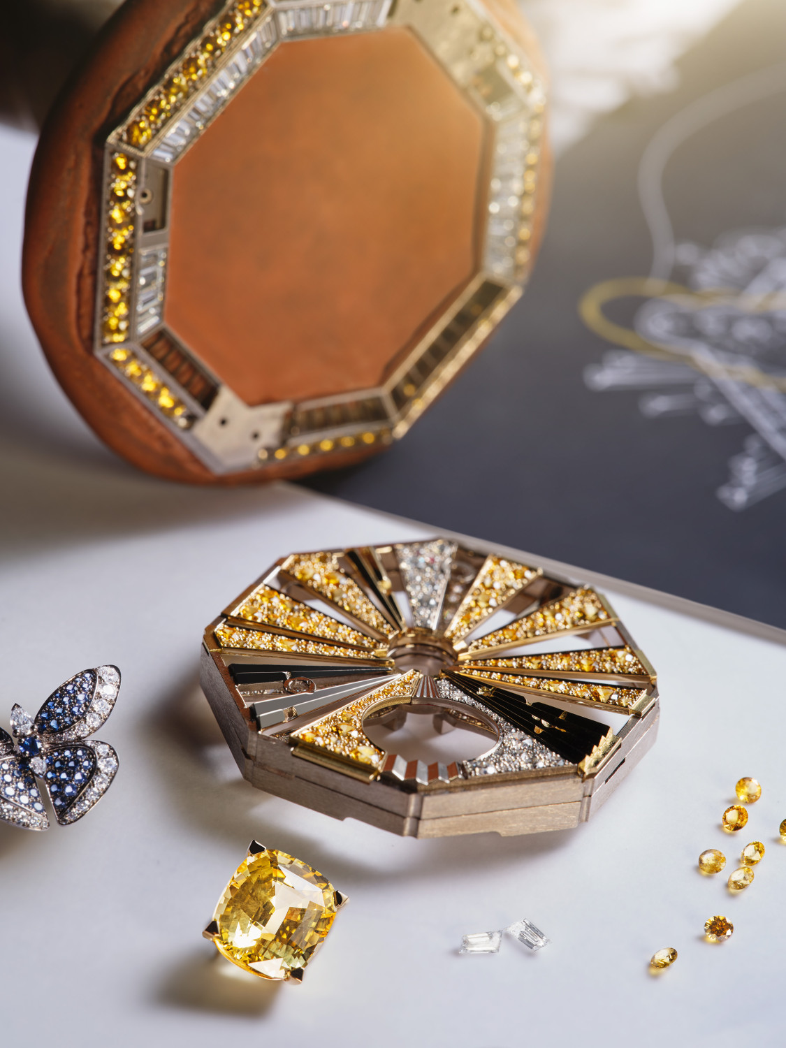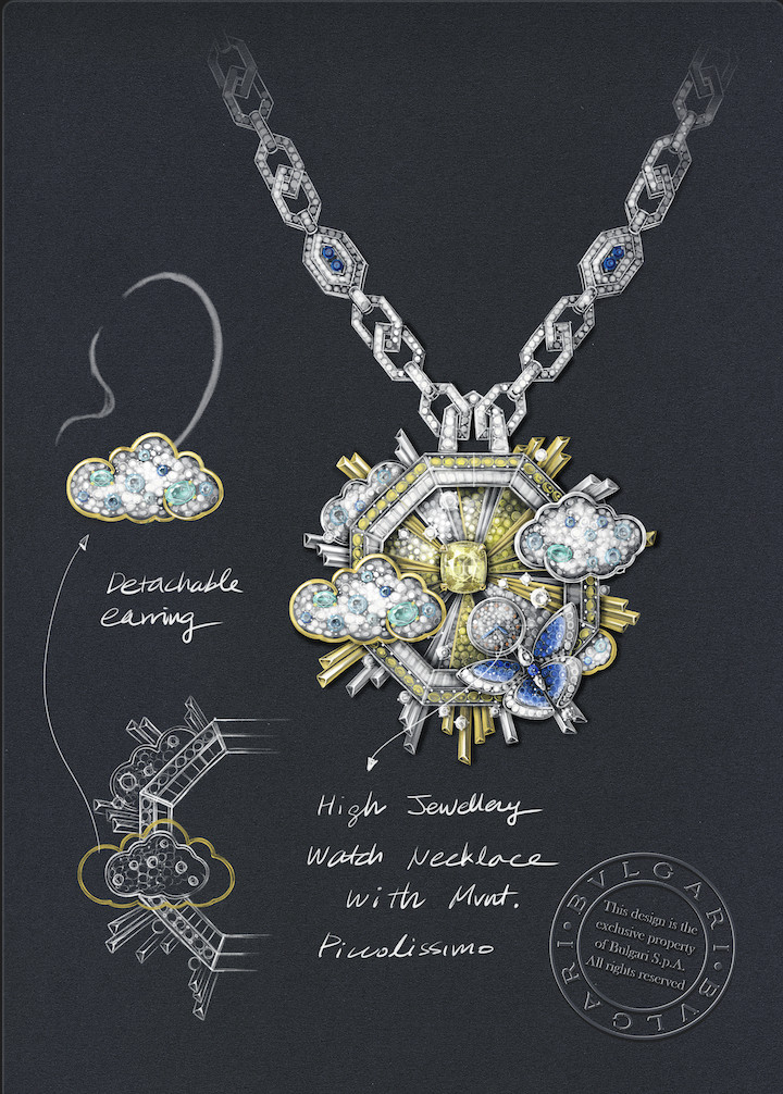 Да, Polychroma — это не только кольца и колье. Это еще и ювелирные часы, в которых швейцарская точность встречается с итальянской театральностью. Nuvole Preziose, например, — это часы-кулон восьмиугольной формы, вдохновленные потолками Базилики Максенция и винтажной брошью. 1560 часов ручной работы, желтый сапфир огранки «подушка» в 6,88 карат, съемные элементы, которые можно носить как серьги… — все это больше похоже на трансформер Haute Joaillerie, чем на аксессуар. А Notte Stellata Diva — это само воплощение ночной римской поэзии. Под куполом, навеянным легендарной огранкой кабошон Bvlgari, раскрывается сказочный циферблат: луна, выложенная бриллиантами огранки «принцесса», сверкает на фоне снежного паве, а вокруг нее кружат светлячки из желтых бриллиантов и синих сапфиров, ускользающих с легкой дрожью тремблеров.