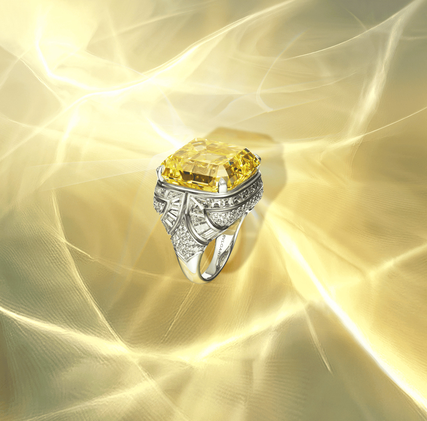 Essence of Yellow — новое прочтение легендарного кольца Trombino, созданного Леонильдой Булгари почти сто лет назад. Этот экземпляр поражает: фантазийный ярко-желтый бриллиант в 45 карат — настолько редкий, что аналогичный встречается раз в 4-5 лет, и один — на восемь миллионов. Его изумрудная огранка «ашер» и световая архитектура оправы делают кольцо олицетворением солнечной энергии и римского совершенства.