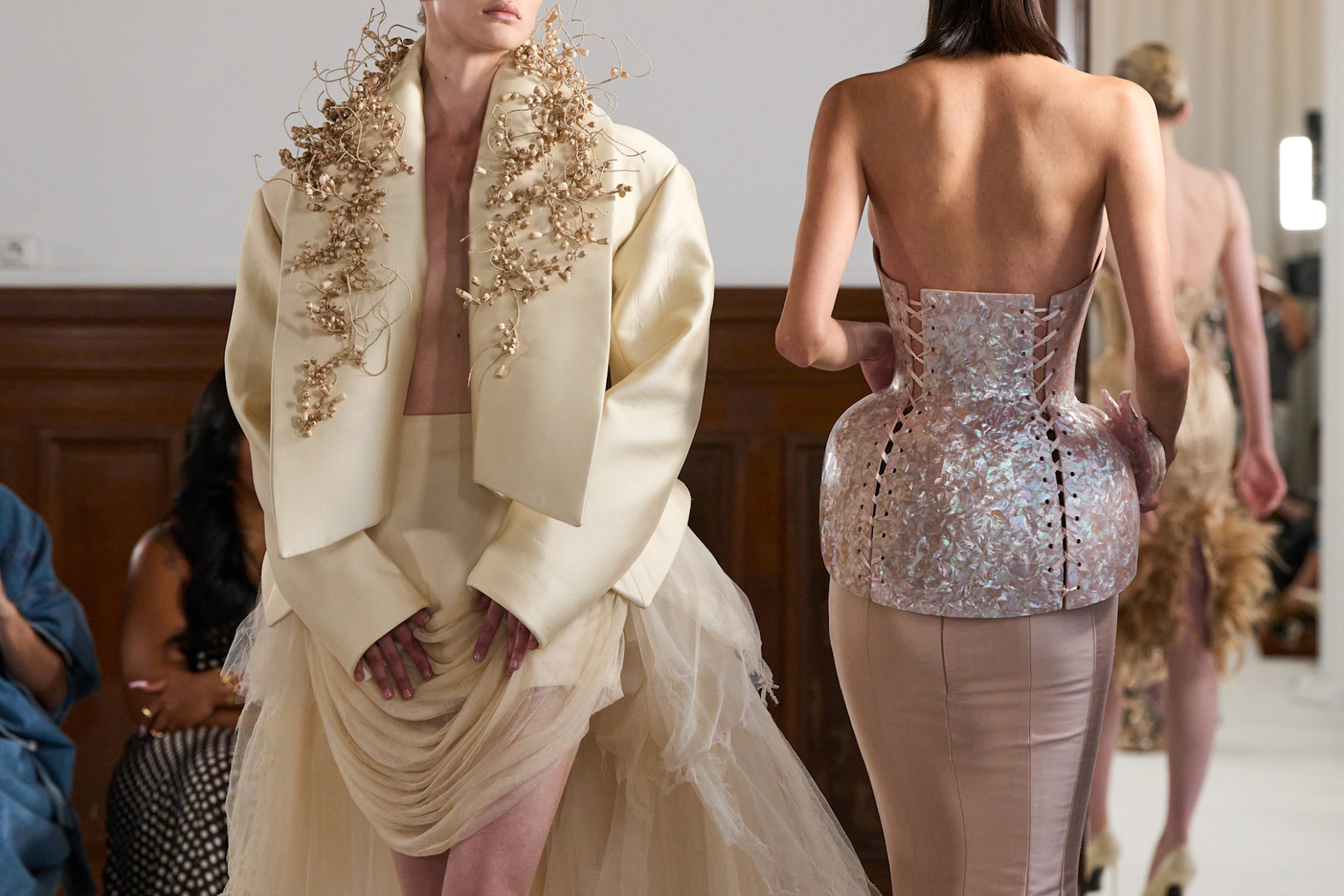 Корсет, к слову, — лейтмотив коллекции. Он то обнажается, превращаясь в скульптуру, то исчезает под полупрозрачным тюлем, оставляя лишь форму. В одних образах он деревянный и почти театральный, в других — невидимый, созданный при помощи moulage. А в некоторых — и вовсе становится частью живой сцены. По одному из корсетов карабкаются миниатюрные обезьянки, по другому — расправляют крылья, вышитые птицы.