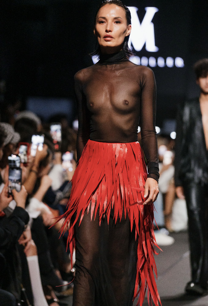 Коллекция началась с почти беззвучного аккорда. Первые образы воспринимались как приглушенные звуки: ткани шептали, оттенки звучали глухо. Хлопок шелестел, кожа хрустела, органза замирала. Каждая ткань становилась звуковой метафорой, раскрывающей глубину замысла. Это была эстетика напряжения — между цифровым и живым, между формой и ее разрушением, между точностью машинного кроя и ошибками, которые мог допустить только человек. Пальто и пиджаки с необработанными краями выглядели так, будто их сознательно оставили незаконченными — как финальная нота, зависшая в воздухе. Пайетки, рассыпанные по ткани, не украшали, а создавали шумовые помехи. Это был сбой системы. Ошибка. Но именно в этом сбое рождалась концепция — новая форма уязвимости.