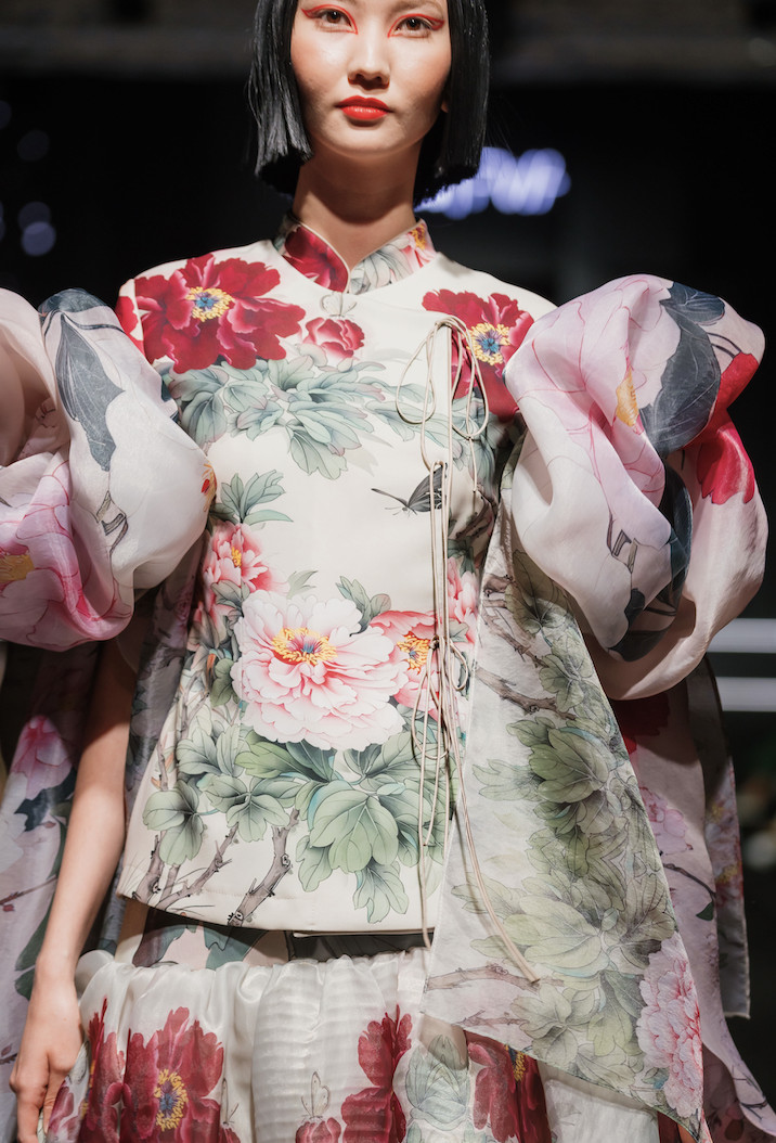 Кимоно здесь — не просто форма. Это мысль, зашитая в ткань. Оно может быть строго геометричным, будто выточено из архитектуры, или мягким и струящимся, словно весенний ветер в шелке. Плечи — то выстроены в скульптурной логике симметрии, то исчезают в драпировках, навевая воспоминание о зыбкости цветущего сада. Здесь кимоно — не отголосок Востока, а его голос. В свою очередь, вышивка — не орнамент, а поэма. Драконы говорят о внутренней силе и преображении, журавли — о балансе, сакура — о мимолетности прекрасного.