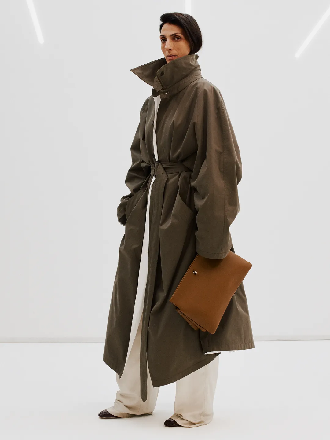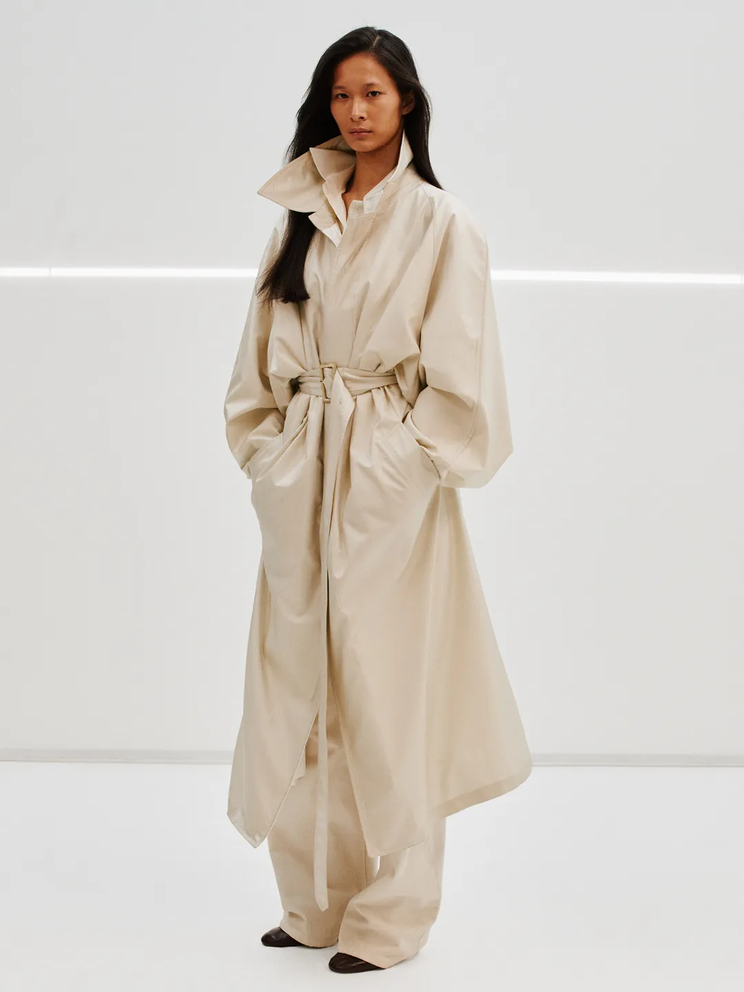 В этой коллекции множество гибридных решений. Тренчкот со стоячим воротником, отсылающий к классическим образцам, неожиданно сочетается с брюками, усыпанными перьями. Это не контраст ради эпатажа, а тонкий диалог между уместным и личным. Театральность здесь не маска, а деталь, которую ты надеваешь, только если действительно хочешь.