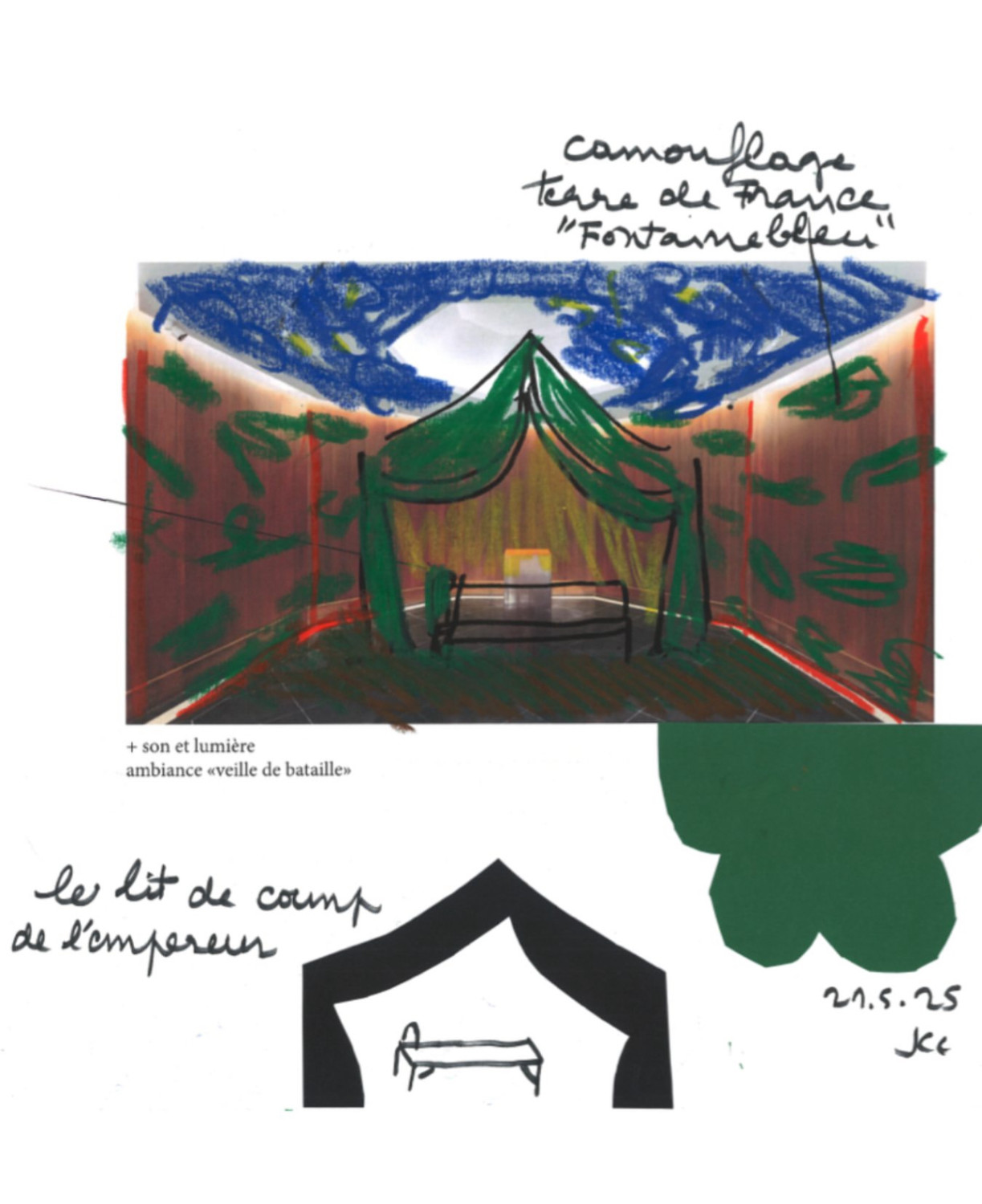Гостей встречает клубящийся туман — прямая отсылка к утренним туманам сражений, о которых Наполеон писал в своих мемуарах. Вокруг — не классические витрины, а гигантские силуэты игрушечных солдат с золотыми контурами — дань детскому увлечению императора тактикой. Над всем этим — зеленый флаг с золотой пчелой, созданный мастерской Doublet, той самой, что шила знамена к открытию Нотр-Дама. Наполеон, к слову, безуспешно мечтал заменить им французский триколор.