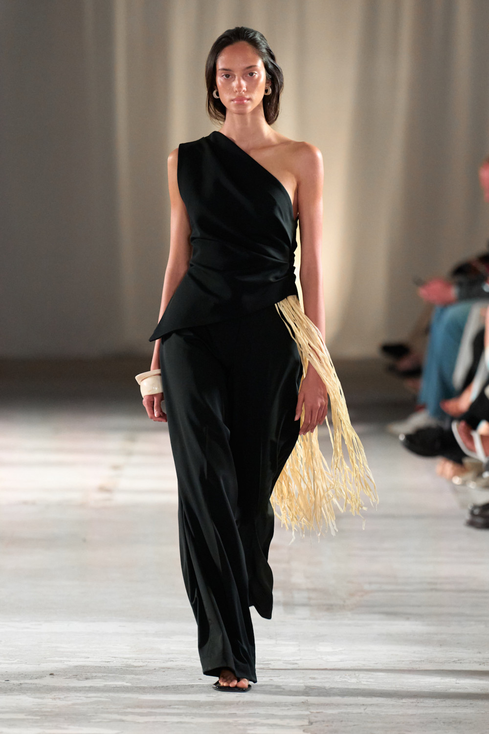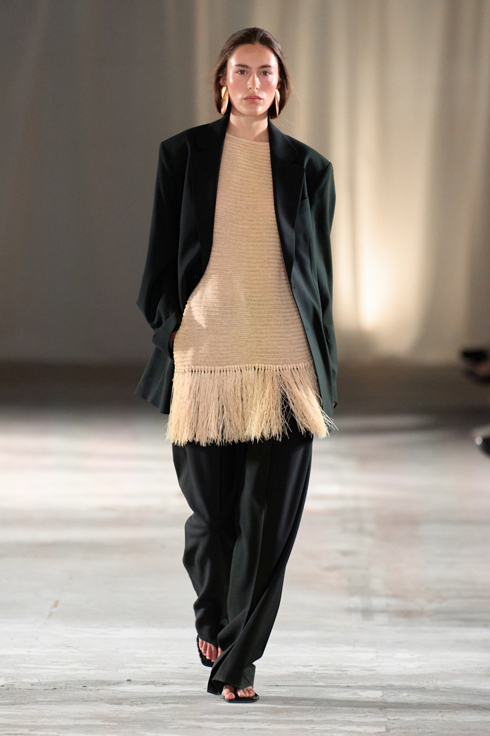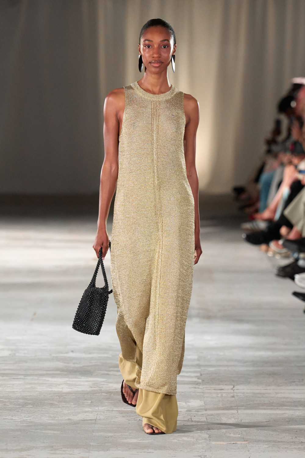 В каждом образе коллекции ощущалось дыхание лета. Одна модель вышла на подиум в костюме с тонкими прядями рафии, колышущимися в такт шагам, другая — в шортах, дополненных бисерной цепочкой, навевающей мысли о пляжных аксессуарах. И все же главным фаворитом редакции стали длинные вязаные платья поверх брюк — смелая стилизация, которая добавляет образу и глубины, и характера.