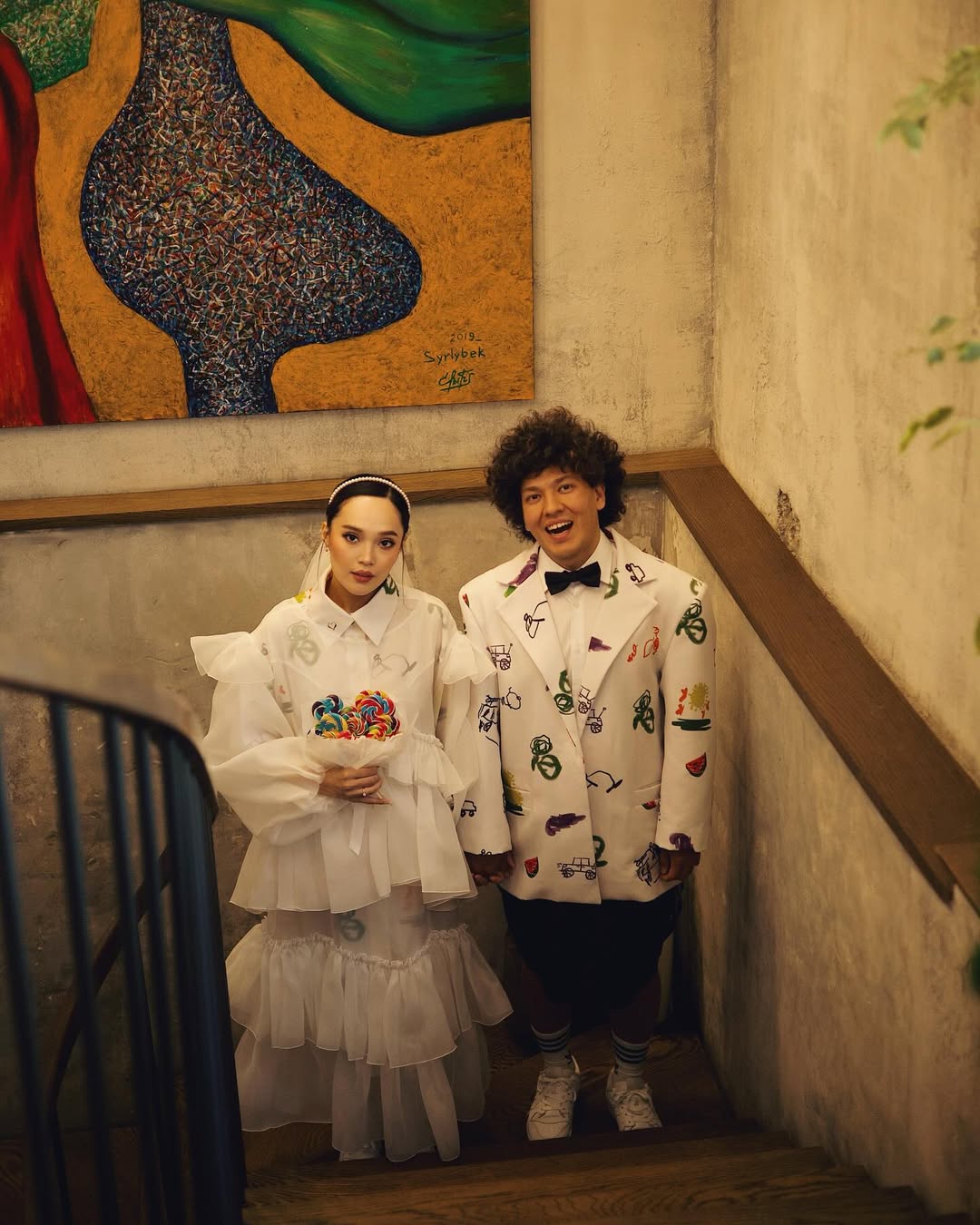 Айжұлдыз үйлену тойына көп қабатты, көлемді ақ көйлек киді. Көйлек ішінде ашық түсті ұлы салған суреттері бар ақ оверсайз жейде. Бұл ерекше қалыңдық образы дәстүрлі гүл шоғының орнына түрлі-түсті лолипоптардан жасалған букетпен толықты.