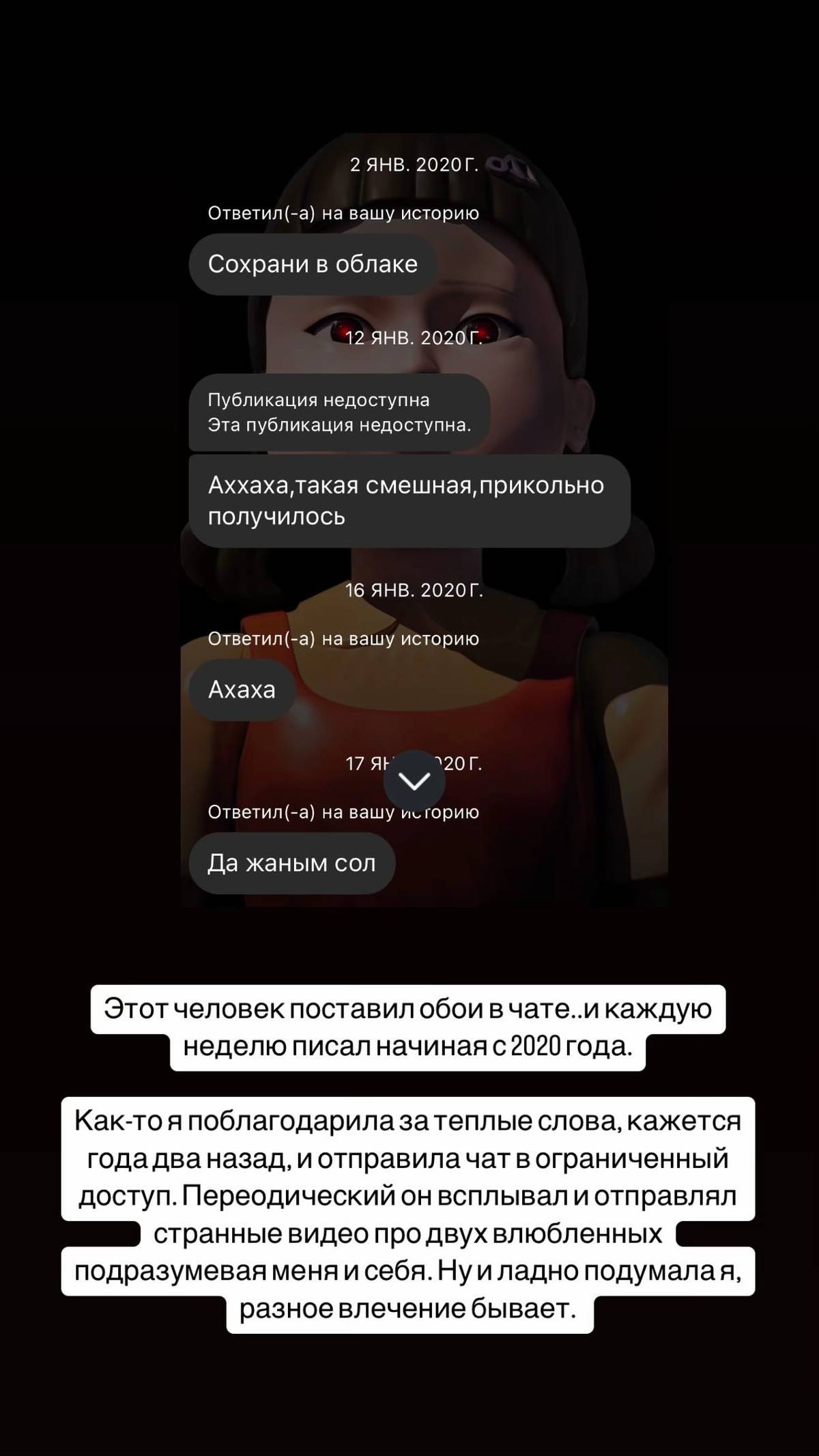 «Бес жылға созылған сталкер. Бұл адам чаттағы фонды өзгертіп, 2020 жылдан бастап әр апта сайын жазып отырды»,