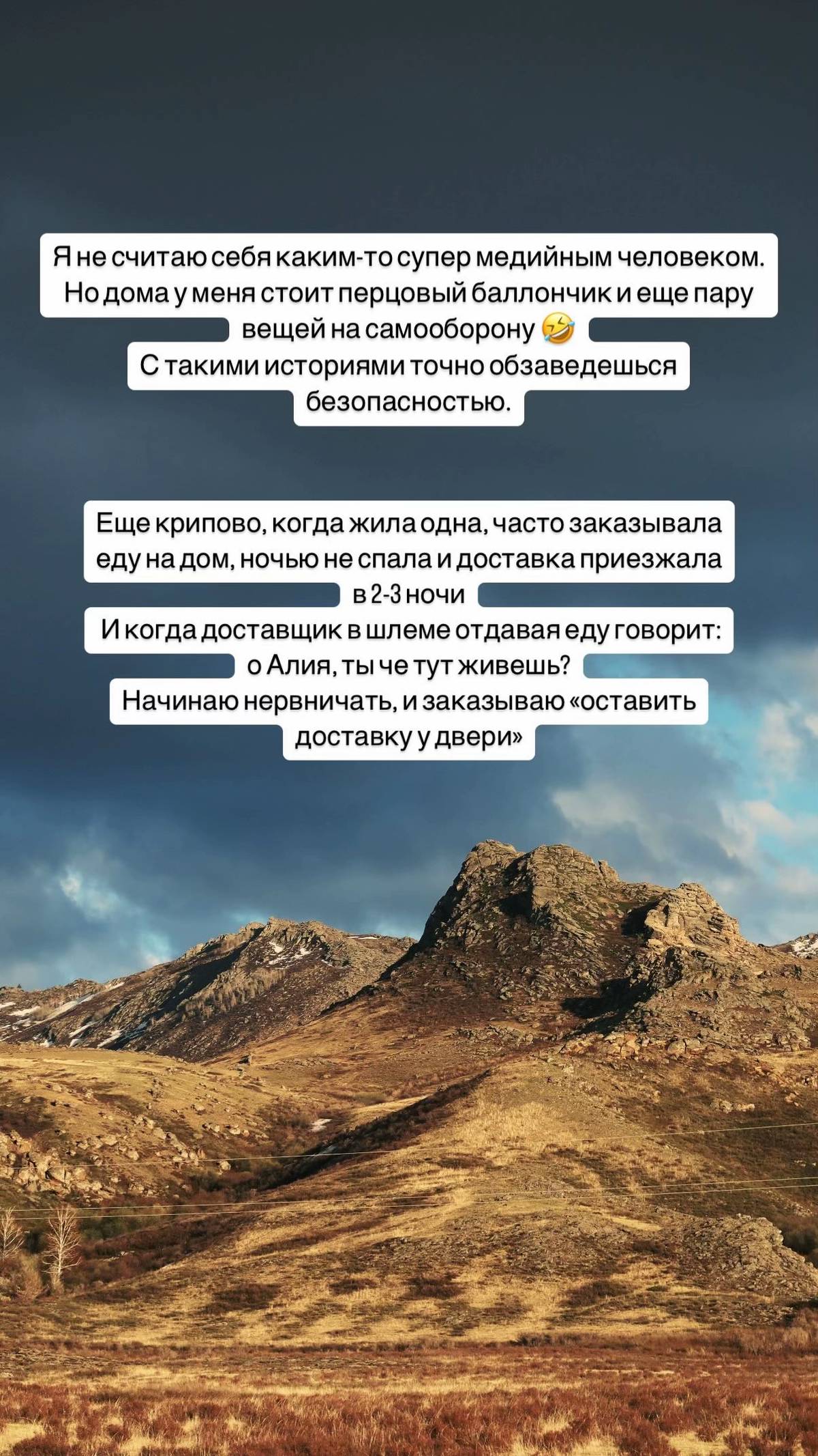Әлия сонымен қатар, түнде тамақ жеткізген курьердің: «О, Әлия, сен осында тұрасың ба?» деген сөзінен кейін жеке қауіпсіздігі туралы тағы да ойлағанын айтты.