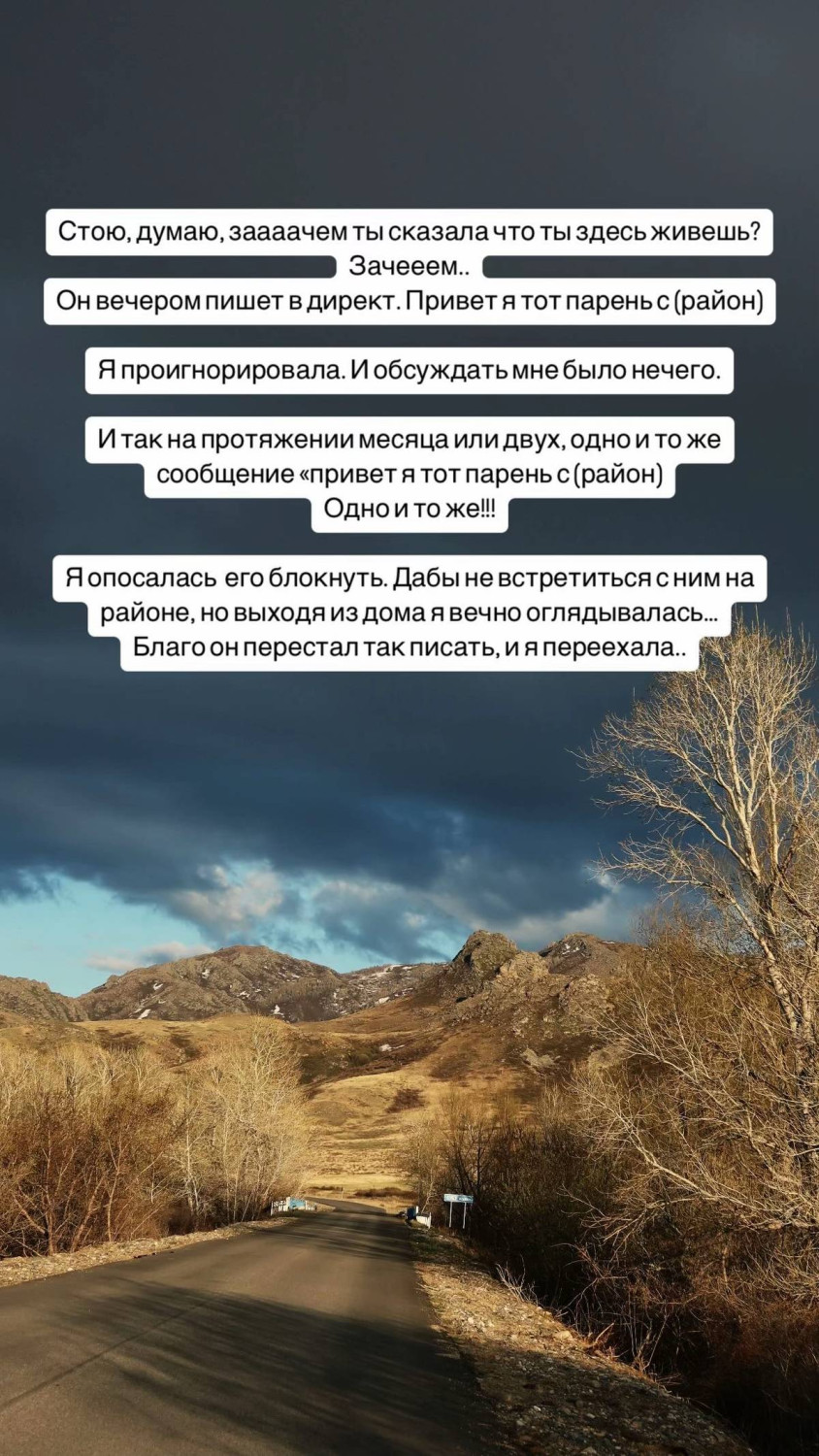 Тағы бір оқиға үйінің ауласында болған. Бір ер адам оны танып, жақын маңда тұратынын түсінген соң, бірнеше ай бойы «Сәлем, мен ана аудандағы жігітпін» деген хабарламалар жіберіп отырған. Блогер оны бұғаттауға қорқып, кездесіп қалудан сескенген.