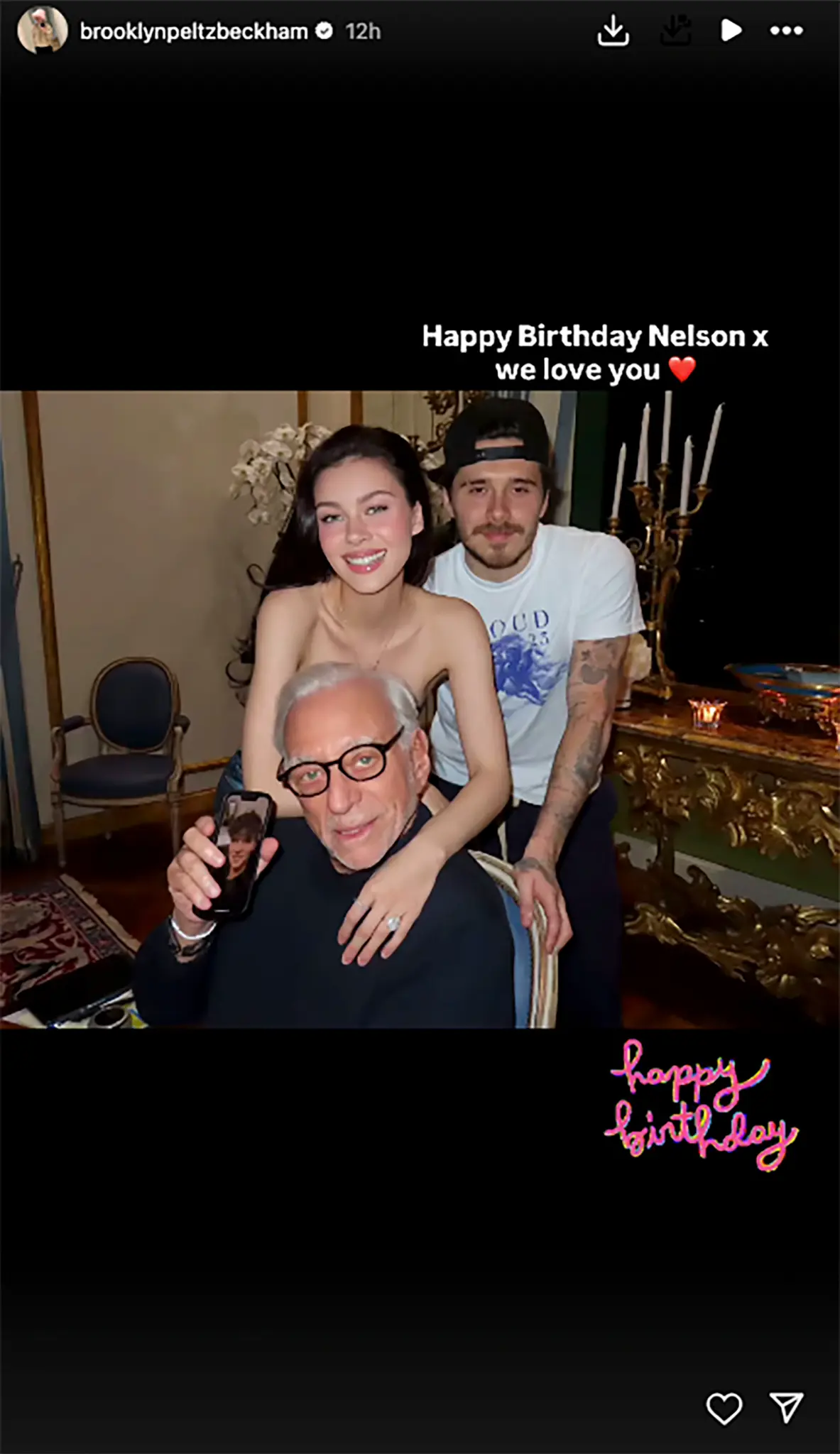 Бруклин Бекхэм отпраздновал 83-й день рождения своего тестя Нельсона Пельтца, разместив фотографию с именинником и своей супругой Николой Пельтц-Бекхэм в соцсетях. При этом на юбилее своего отца Дэвида Бекхэма он не появился и не делал никаких публичных поздравлений.