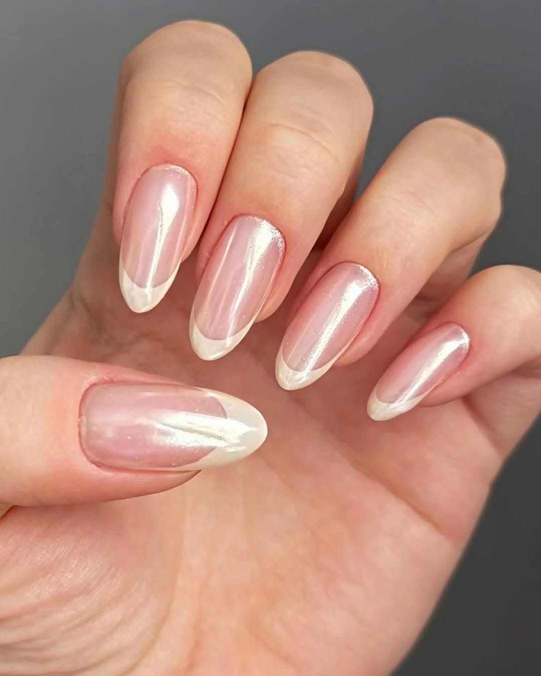 Бұл дизайн deep 90s French деп аталды. Ол табиғилықты аздап театралдылықпен үйлестіретін эстетикаға сілтеме жасайды. Негізгі айырмашылығы неде? Ақ доға әлдеқайда қалың әрі тырнақтың орта тұсынан басталады. Мұндай маникюр бір мезетте ұстамды да, әсерлі де көрінеді.