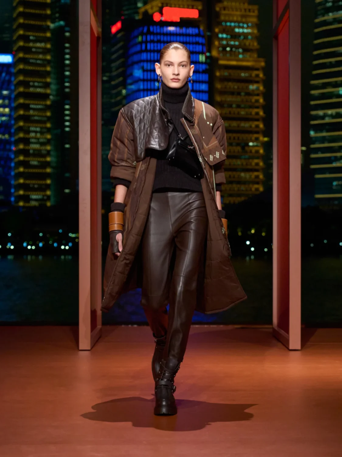 В ритме города, среди стекла и бетона, родилась новая героиня Hermès. Она свободна, многослойна — как и ее мысли, — и так же подвижна. Ее гардероб — адаптивный и умный, где кожа — безупречная, как всегда, — становится полем для экспериментов. Пальто-трансформеры играют с формой, платье легко превращается в юбку и жилет, а куртка — в шарф. Все меняется одним движением молнии — подстраиваясь под ритм дня, маршрут или внезапное настроение.