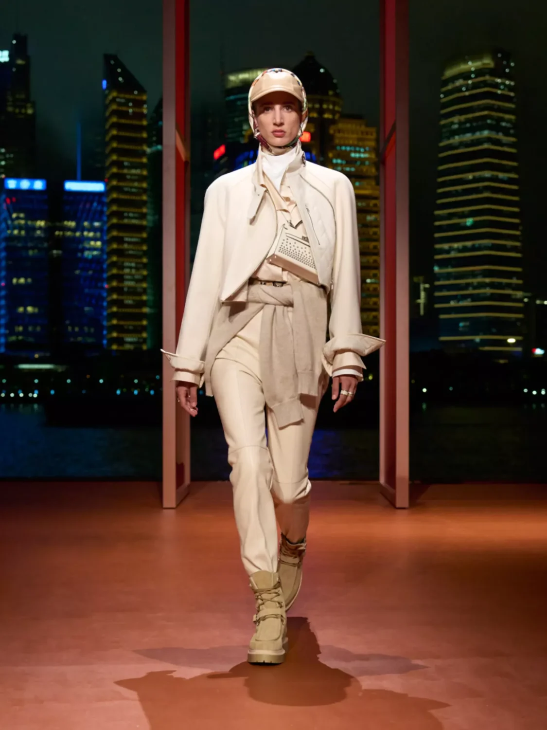 Стоит отметить, если парижская часть коллекции была сдержанной — графитовой, с проблесками цвета, — то в Шанхае разлились густые, благородные тона: бордо, охра, индиго, сливочный белый и, конечно, огненный оранжевый. В этих тонах были выполнены трикотажные платья, водонепроницаемые кейпы, вывернутые наизнанку бомберы, где внутренняя красота становится внешней, и аксессуары, рожденные в ритме мегаполиса. Mini Kelly на тонком ремешке — словно ожерелье. Шарфы, завязанные поверх бейсболок и зафиксированные кольцами в форме стремени. Кожаные наушники, превращенные в украшения. Все это — ироничный реверанс уличной моде, переосмысленной через призму Hermès. Сдержанно, но дерзко.