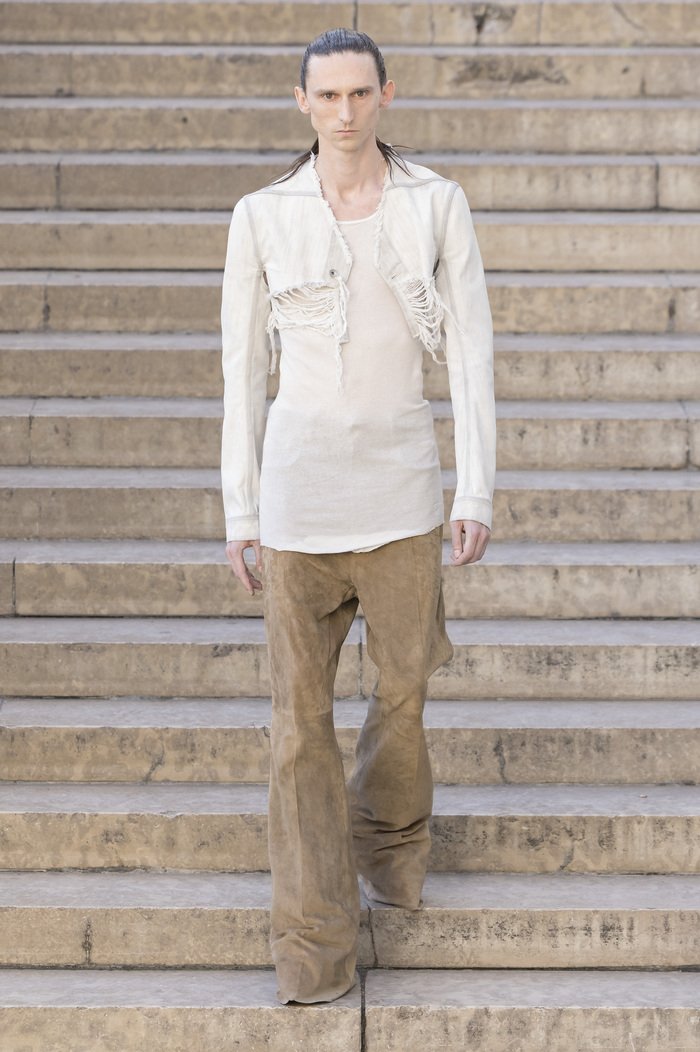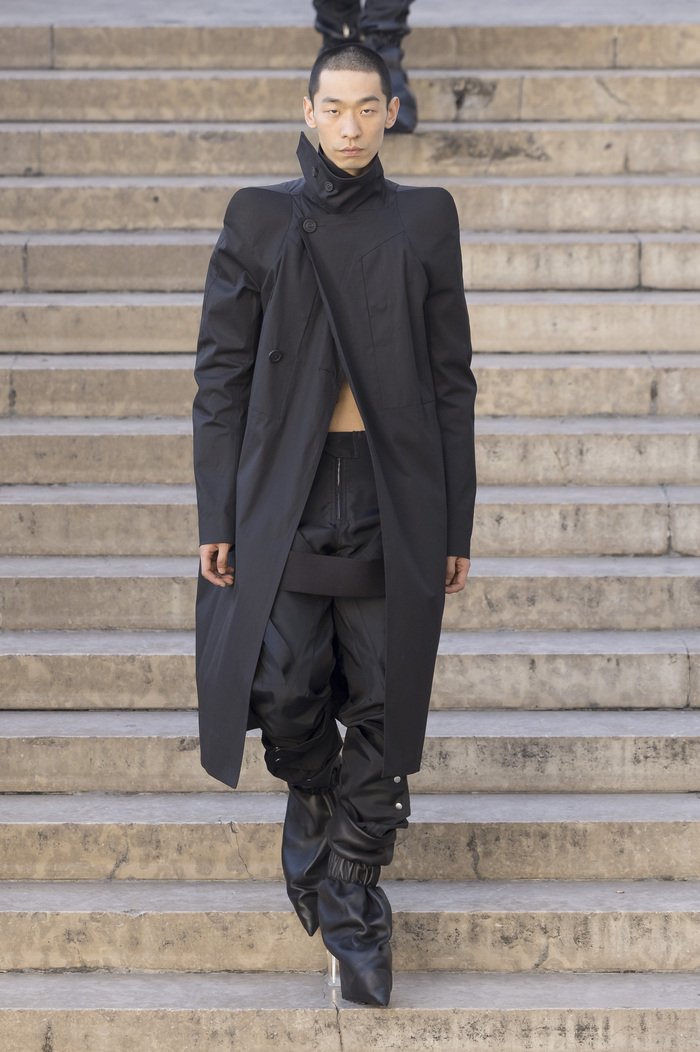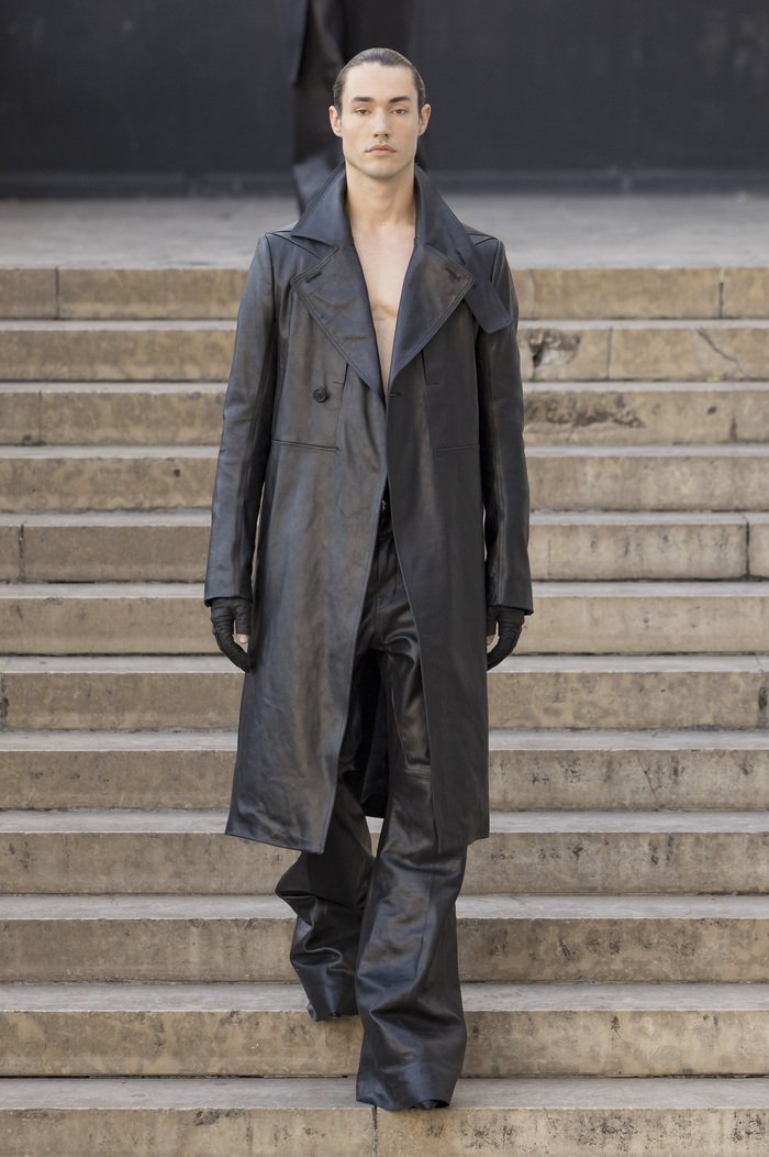 В этих образах — размышления о теле, времени, красоте и увядании. Не страх перед концом, а тихое его принятие. Возвращаются знаковые драпировки, появляются перешитые куртки с настроением нью-йоркского панка, созданные совместно с Suicide, и переосмысленный трикотаж начала нулевых — работа Терри-Энн Френкен, давней подруги Рика и экс-модели его шоурума. Все исполнено в черной коже, шелке и нейлоне, дополнено бахромой, деконструкцией и театральными «воротниками-дракулой», знакомыми по прошлой коллекции.