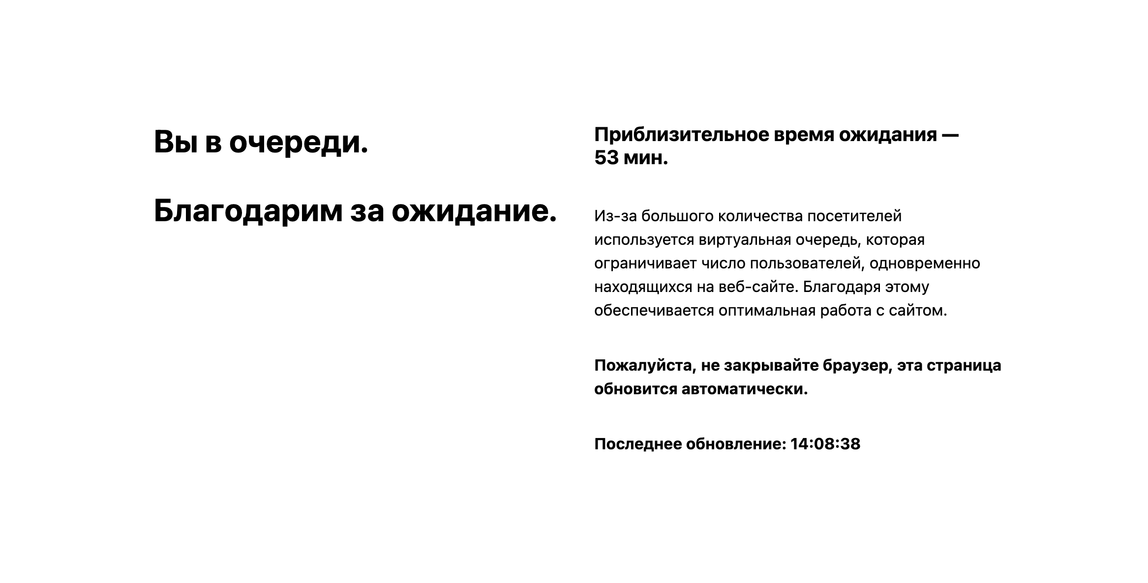 «Из-за большого количества посетителей используется виртуальная очередь, которая ограничивает число пользователей, одновременно находящихся на веб-сайте».