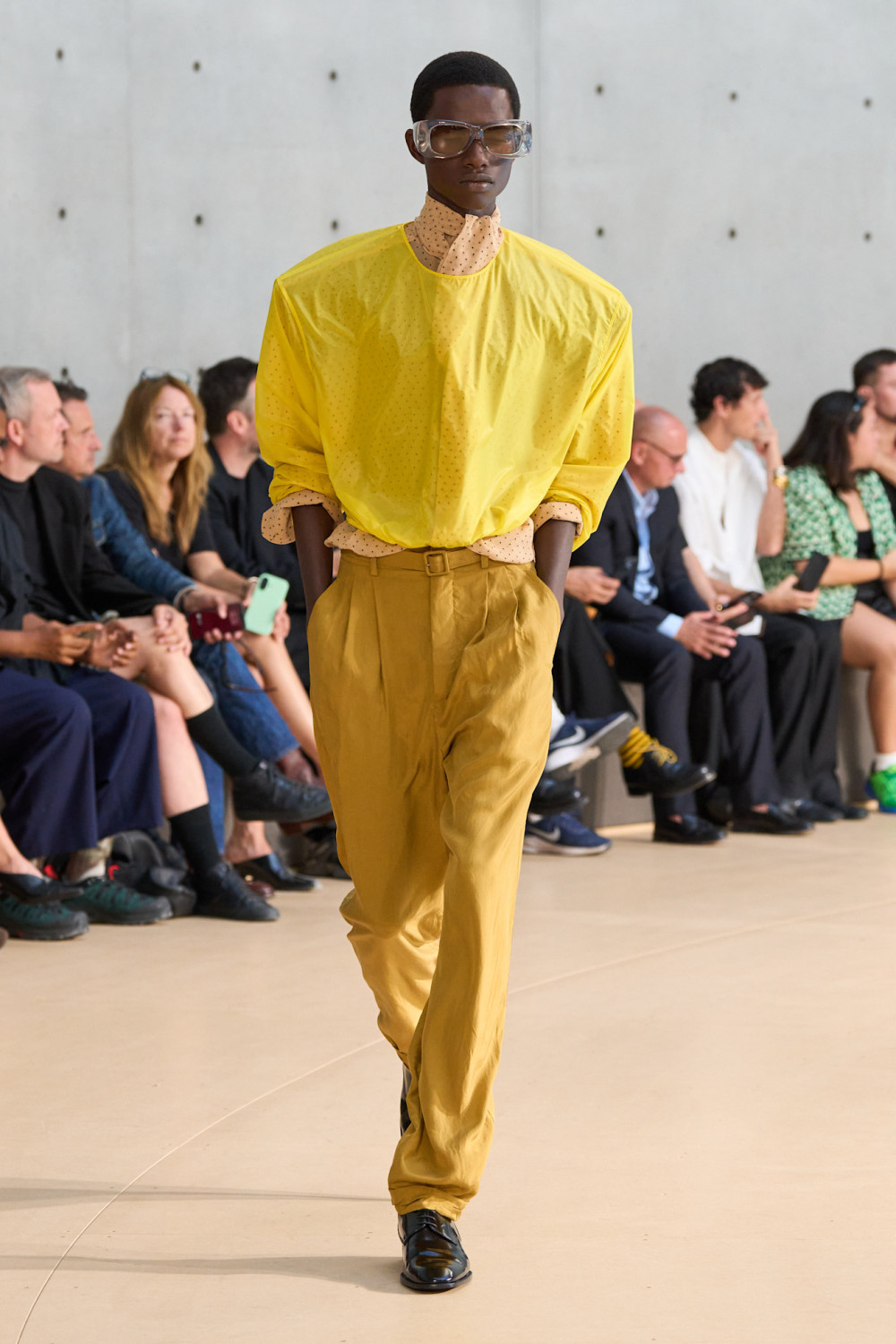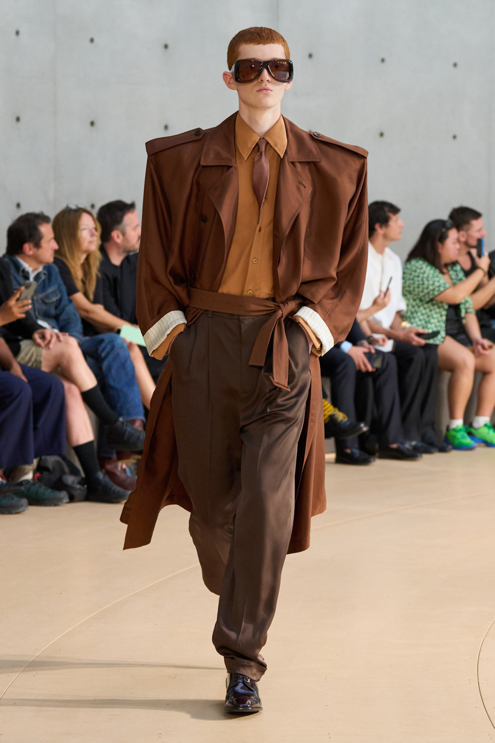 Рубашки здесь — не просто базовая вещь. Это фокус коллекции, ее тончайшая материя. Их много, и каждая — как произведение. Из невесомого нейлона, в оттенках лимонного, персикового, пыльно-розового. Из струящегося шелка, с карманами в духе военной формы, объемом 80-х и легким налетом ностальгии. Дополнением им (и акцентом) служат галстуки — и не классические. Они были заправлены между пуговицами — интимный жест, заметный только при близком взгляде.
