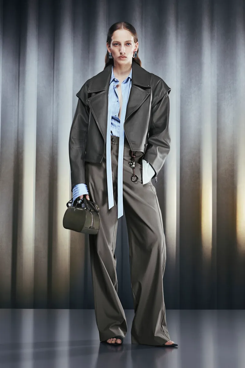 Фактура становится языком, на котором говорит вся коллекция. Куртки и блузоны из канвы с маслянистым блеском, деним с кислотной обработкой, нейлон, окрашенный так, будто это не ткань, а живопись. Все здесь — про прикосновение.