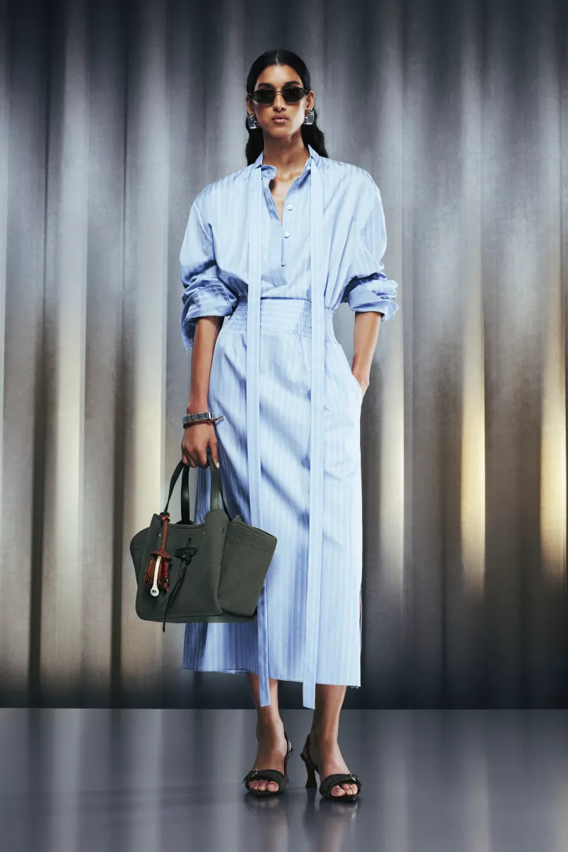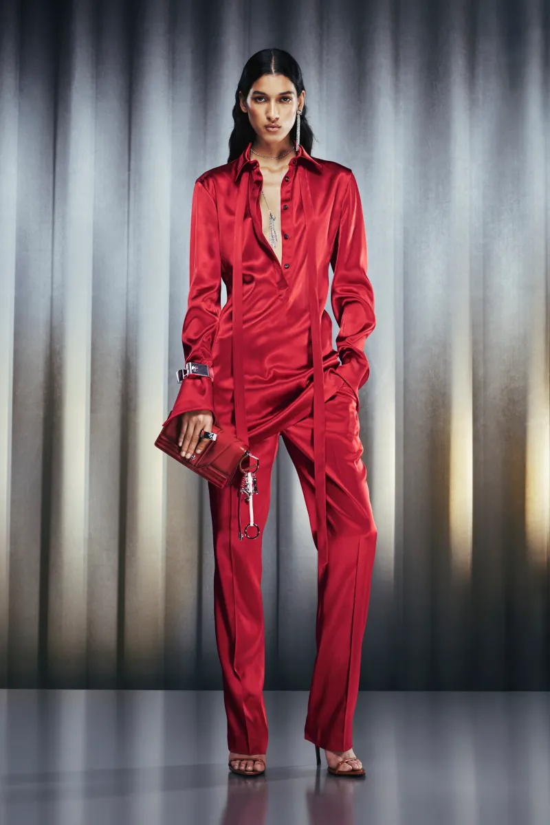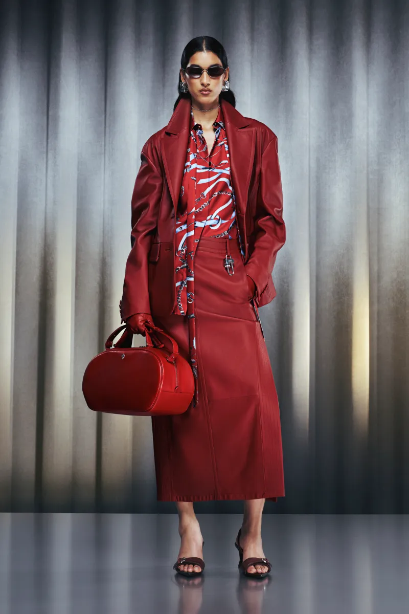 Коллекция получилась до мурашек честной — выверенной, сдержанной, но при этом невероятно выразительной. Здесь много кожи — мягкой, шелковистой, с пудровым отблеском или эффектом благородной поношенности. Её драпируют, складывают, вырезают, превращая в жакеты, юбки и мини-платья с графичным мотивом 7×7 — отсылкой к легендарным гоночным костюмам Ferrari.