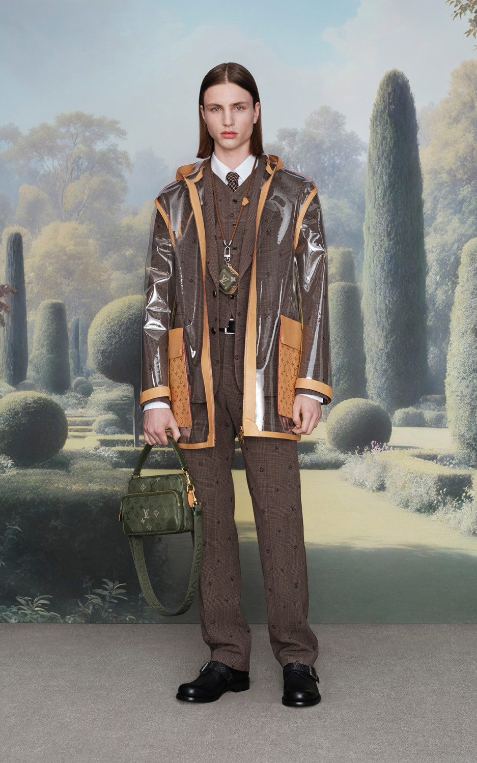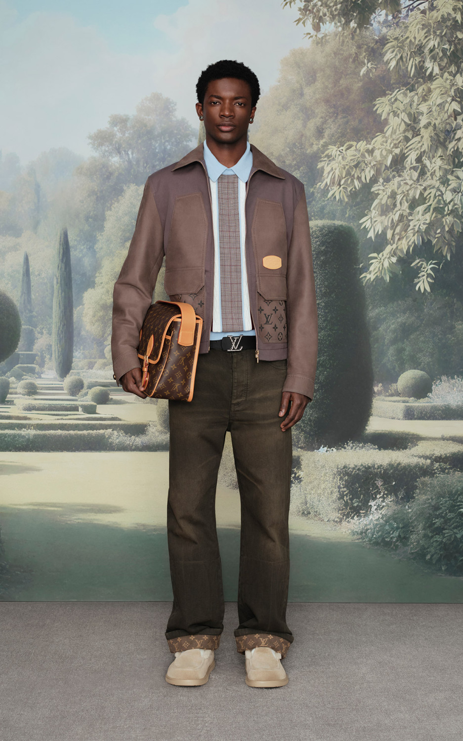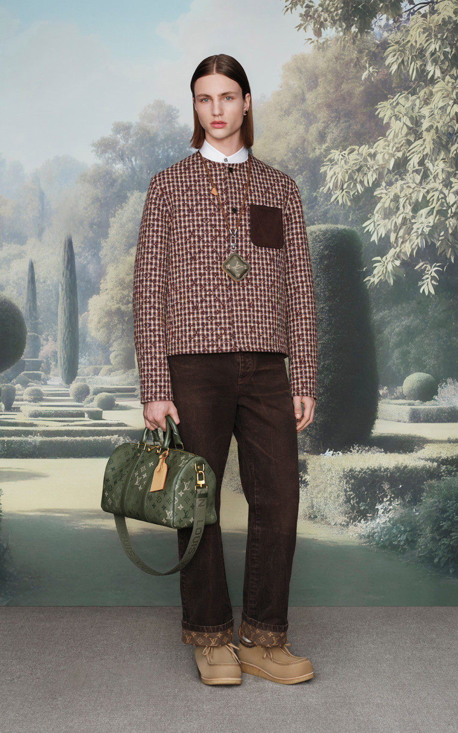 Коллекция делится на два настроения: дневное и вечернее. Первая часть — для тех, кто бродит по мокрым лугам и лесным тропам. Здесь — куртки в стиле Принца Уэльского, шерстяные шорты, стеганые жилеты с культовым Monogram. Вторая — для тех, кто уже вернулся домой, снял резиновые сапоги и устроился у камина с бокалом вина. Это элегантные костюмы из кашемира, кардиганы с ромбами, шелковые рубашки с логотипом LV и даже кожаная куртка trompe-l’œil. Все это объединяет один мотив — принт Monogram Surplus. Приглушенный, камуфляжного характера. Он то растворяется в пейзаже, то появляется на пуховиках, сумках, палатках и даже туристических стульях.
