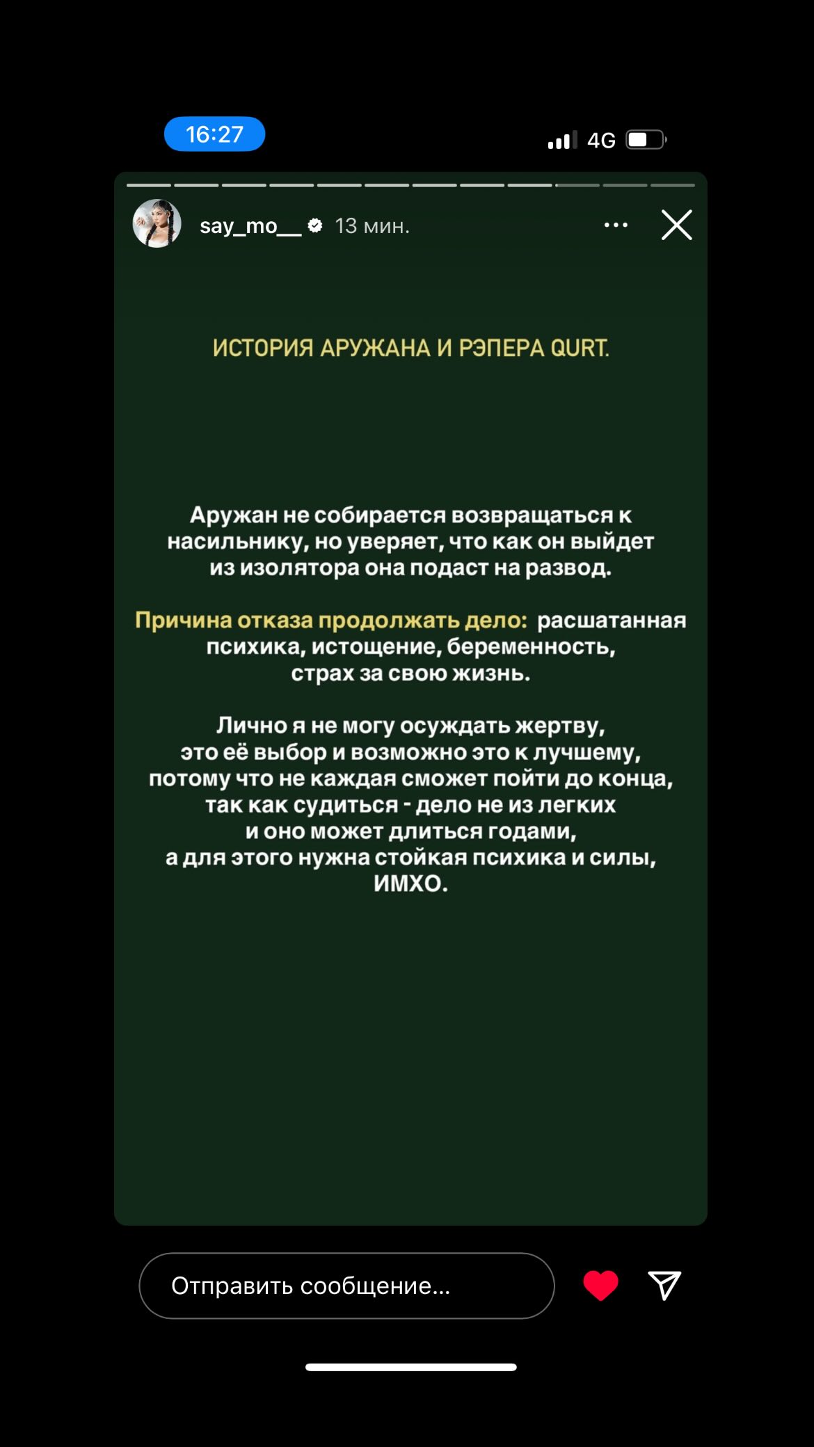 «Аружан не собирается возвращаться к насильнику, но уверяет, что как он выйдет из изолятора она подаст на развод. Причина отказа продолжать дело: расшатанная психика, истощение, беременность, страх за свою жизнь. Лично я не могу осуждать жертву, это ее выбор и возможно это к лучшему, потому что не каждая сможет пойти до конца, так как судиться — дело не из легких, и оно может длиться годами, а для этого нужна стойкая психика и силы».