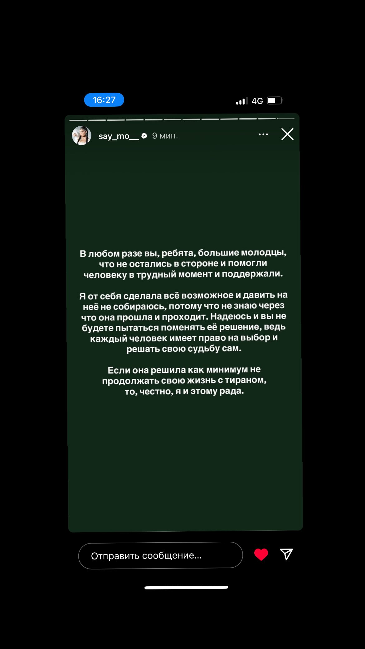 «В любом разе вы, ребята, большие молодцы, что не остались в стороне и помогли человеку в трудный момент и поддержали. Я от себя сделала все возможное и давить на нее не собираюсь, потому что не знаю через что она прошла и проходит. Надеюсь и вы не будете пытаться поменять ее решение, ведь каждый человек имеет право на выбор и решать свою судьбу сам. Если она решила как минимум не продолжать свою жизнь с тираном, то, честно, я и этому рада».