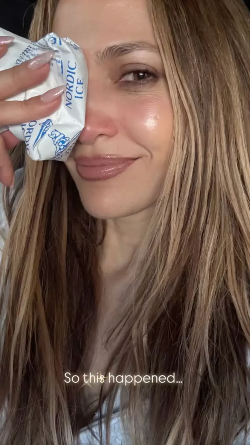В Instagram Stories она поделилась фотографиями: на одной из них Джей Ло держала пакет со льдом у глаза, на другой — продемонстрировала рану на переносице и отек.