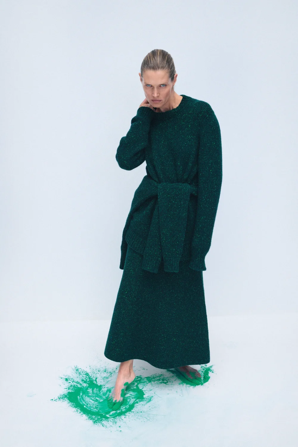 Если сытость пока остается для нее абстрактным понятием, то приверженность безупречному качеству — давняя и неизменная. Коллекция словно создана по законам личной алхимии: воздушный кашемир, украшенный крошечными стеклянными бусинами, мужские тренчкоты, четкие линии плеч у жакетов, пальто, которое легко завязать на бедрах, и свитеры, напоминающие хлопковую футболку, но дарящие ощущение «неба» — именно так Херст описывает одно из своих любимых изделий.