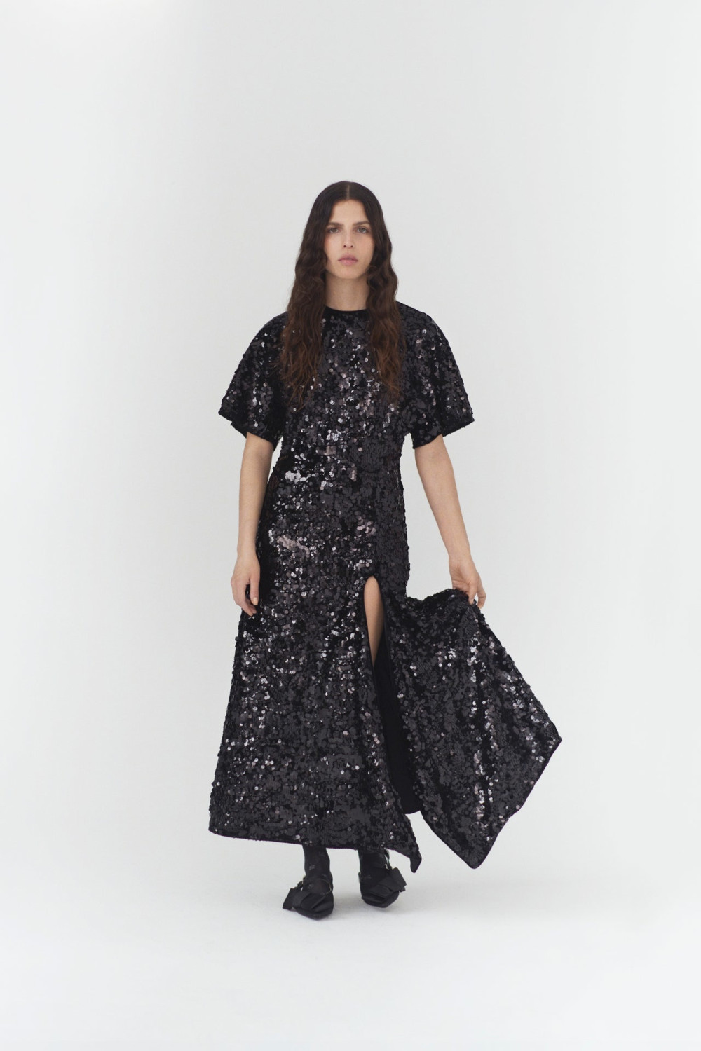 Коллекция начинается с образа, который хочется разобрать на цитаты: пушистое пальто с застежками, будто позаимствованное у Паддингтона, накинуто поверх пайеточного платья с драматичным бантом. Как будто уют и гламур решили устроить свидание — и у них все сложилось. Да, силуэты стали строже, длина — благороднее, но но главное не изменилось — это все еще гардероб девушки, которая выбирает вещи не по возрасту, а по настроению.