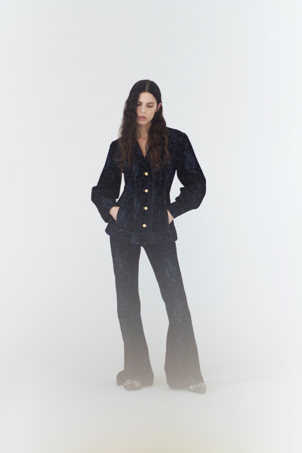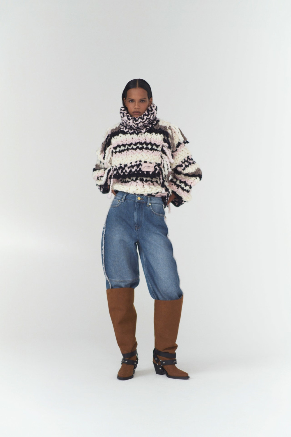 Знаковая эклектика Ganni — она никуда не делась: три яруса слоев, воротнички Питера Пэна, деним с цветами, как с винтажных обоев, и трикотаж — почти терапия. Здесь и свитер с кроликом и эко-посланием (один — чтобы согреться, другой — чтобы заявить позицию), и желтые нити ностальгии, и ироничные «истории», от которых становится чуть теплее не только телу, но и сердцу.