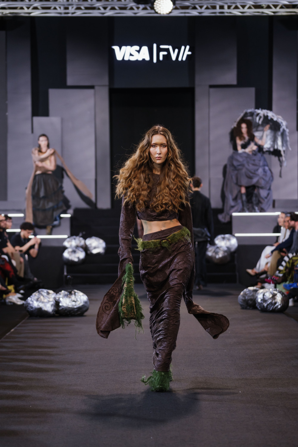Самое сильное — это не громкость коллекции, а ее молчание. Ни одного прямого лозунга. Ни одной фразы на спине. Только правда, сказанная без слов. Серебристый зонт, который держит модель, — не защита, а символ бессилия. Юбка, будто собранная из вещей, забытых и выброшенных на свалке, — не фантазия, а отражение той самой реальности, в которой мы уже обосновались.
