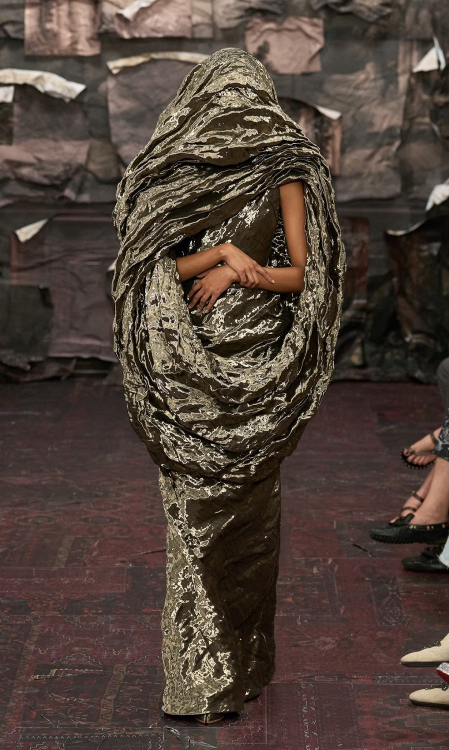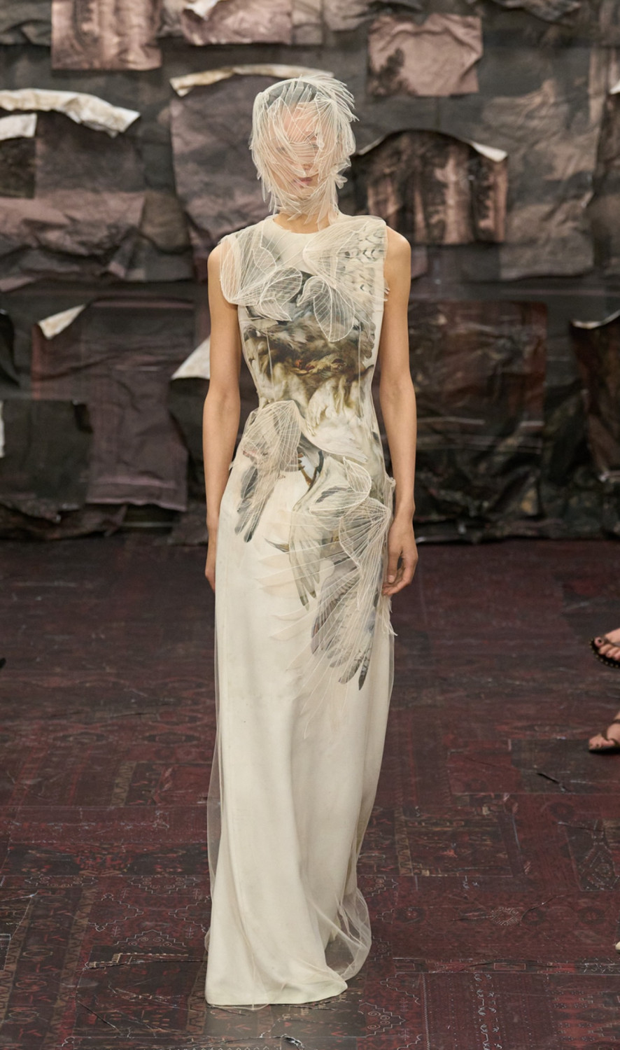 Коллекция словно пропитана атмосферой родной для дизайнера Фландрии — ее туманами, старинной архитектурой и искусным наследием. Здесь были и цветочные гобелены, и охотничьи птицы, словно со старинных натюрмортов, и многослойность, напоминающая старую живопись. Все это завершилось финальным аккордом — ярко-зеленым платьем с рельефным верхом и маской-цветком. Образом, который как будто аплодировал сам себе.