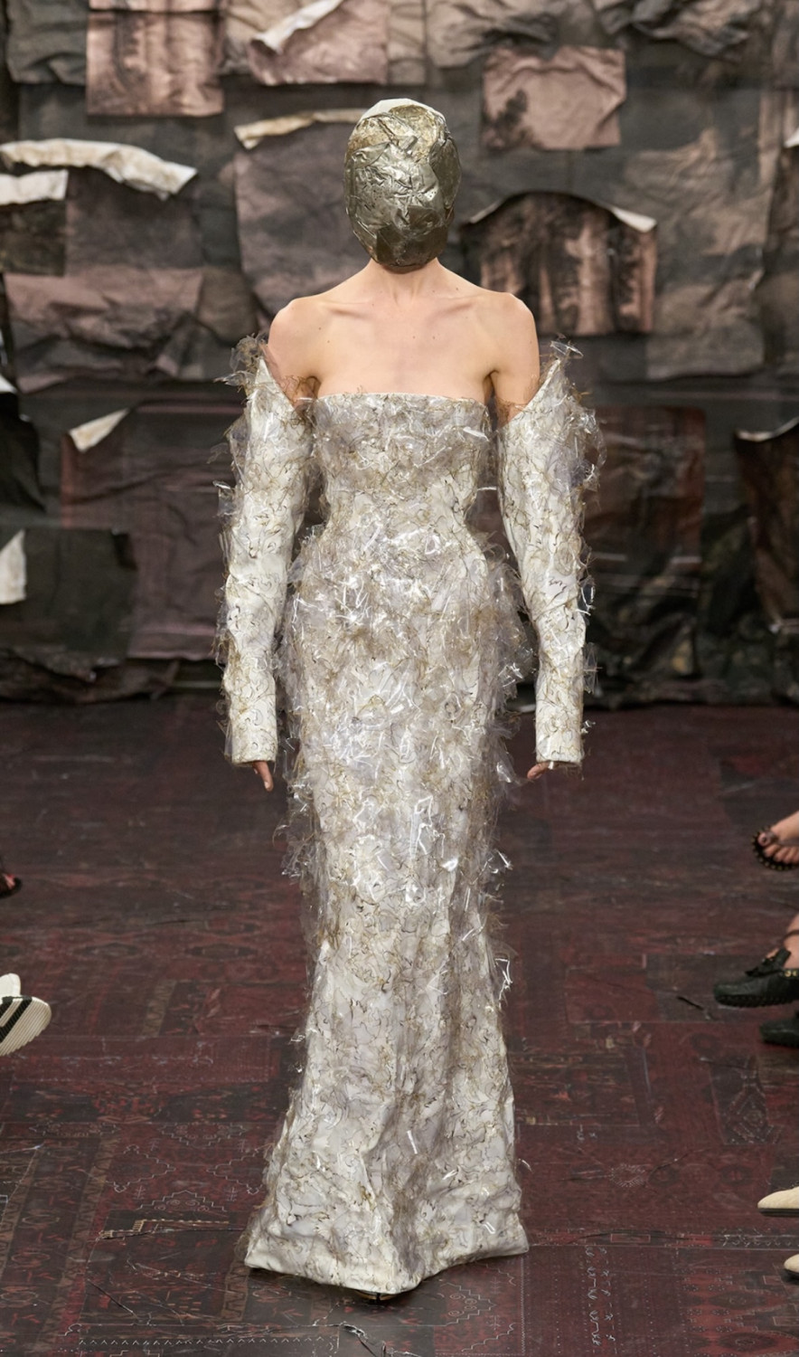 Коллекция стартовала с прозрачного платья из ПВХ — словно запаянного в целлофан, — омажа коллекции осень-зима 1998 и любви Маржелы к «неблагородным» материалам. Далее — металлические ткани, бархат, деним и даже подкладочные материалы, которые разбирались и собирались заново, превращаясь в сложные, почти архитектурные конструкции.