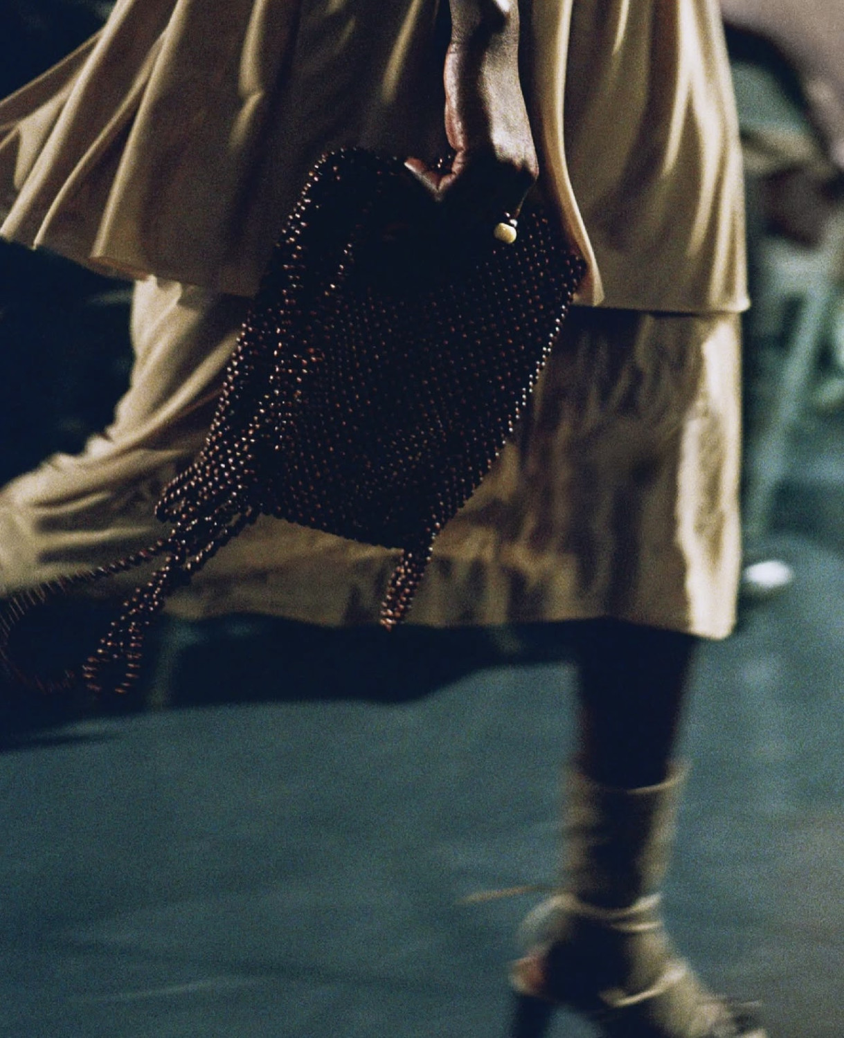 Здесь не кричат тренды — здесь говорят полутоном. Вот асимметричная юбка, будто собранная наскоро на булавках. Вот струящееся платье из джерси, небрежно спадающее с плеч. Вот костюмный жакет, накинутый поверх майки — строгость и уязвимость в одном кадре. Все выглядит так, будто ты просто взяла первое, что оказалось под рукой. Но это «первое» — совершенство.