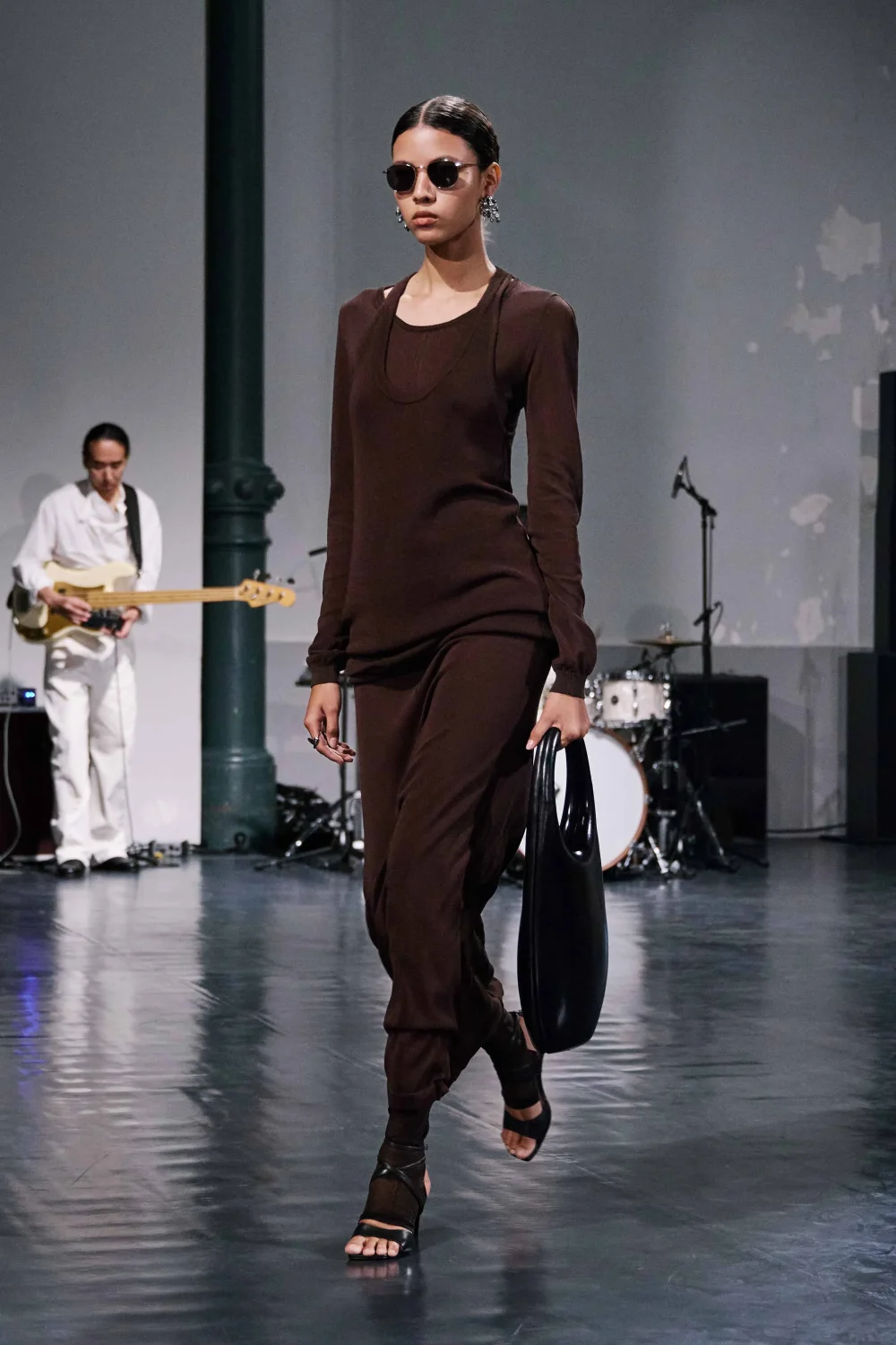 Особое удовольствие — наблюдать, как Lemaire играет на контрастах. Структурный верх — и флюидный низ. Формальное — рядом с домашним. Жесткое — с мягким. Узкие пиджаки соседствуют с пижамными брюками, блузки — с расклешенными штанами. И все это пронизано географическими отголосками. Здесь есть аллюзии на вьетнамское платье áo dài, на юбки народа мяо, на Дикий Запад с его рубашками и галстуками-боло — и это не эклектика ради эклектики, а скорее тонкий, почти интуитивный коллаж воспоминаний. Как память о местах, где ты уже была, и о тех, куда еще только хочешь однажды сбежать.
