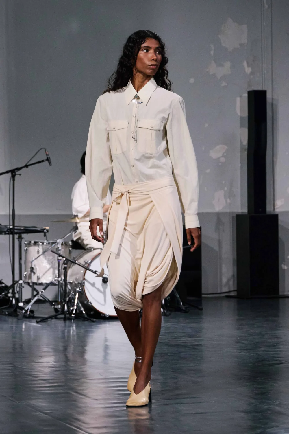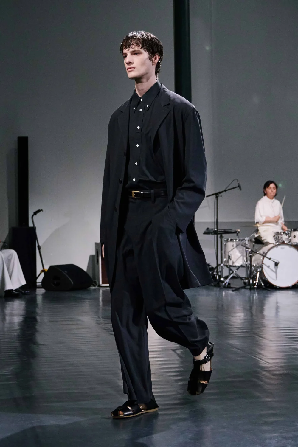 На показе, прошедшем в рамках мужской Недели моды, звучали живые барабаны и басы — перкуссионный дуэт, созданный специально для шоу. Этот ритм не разгонял, а уравновешивал. Сердцебиение города в моменте, когда оно замедляется. Это была не просто музыка — ощущение. Точно в унисон с одеждой: многослойной, воздушной, чуть небрежной, но до мелочей выверенной.