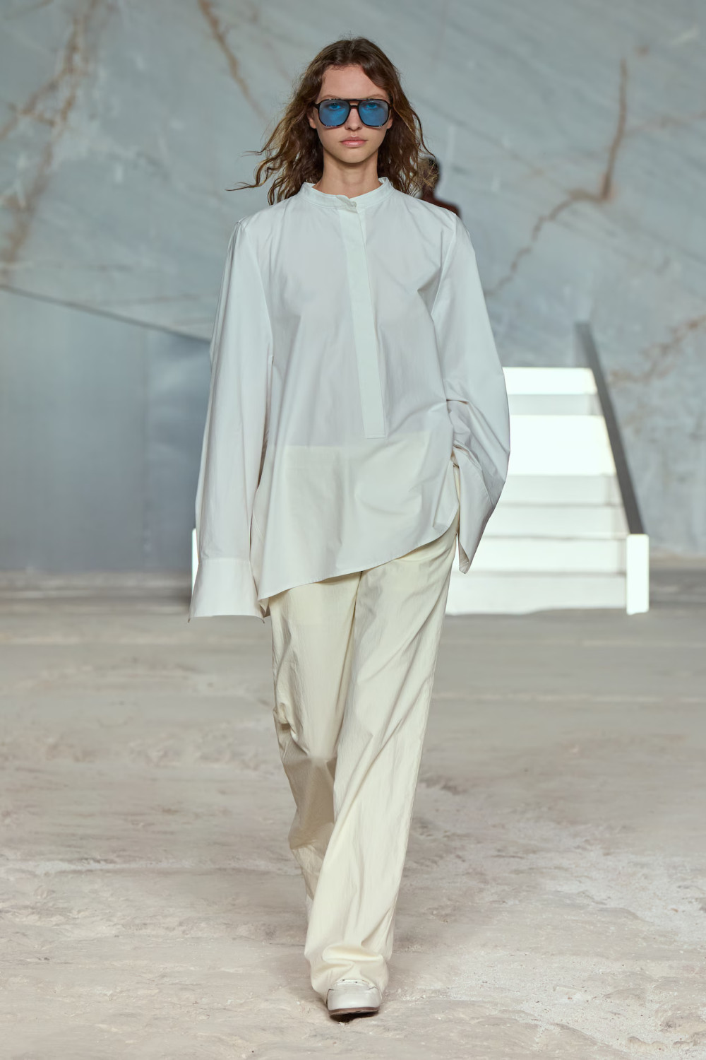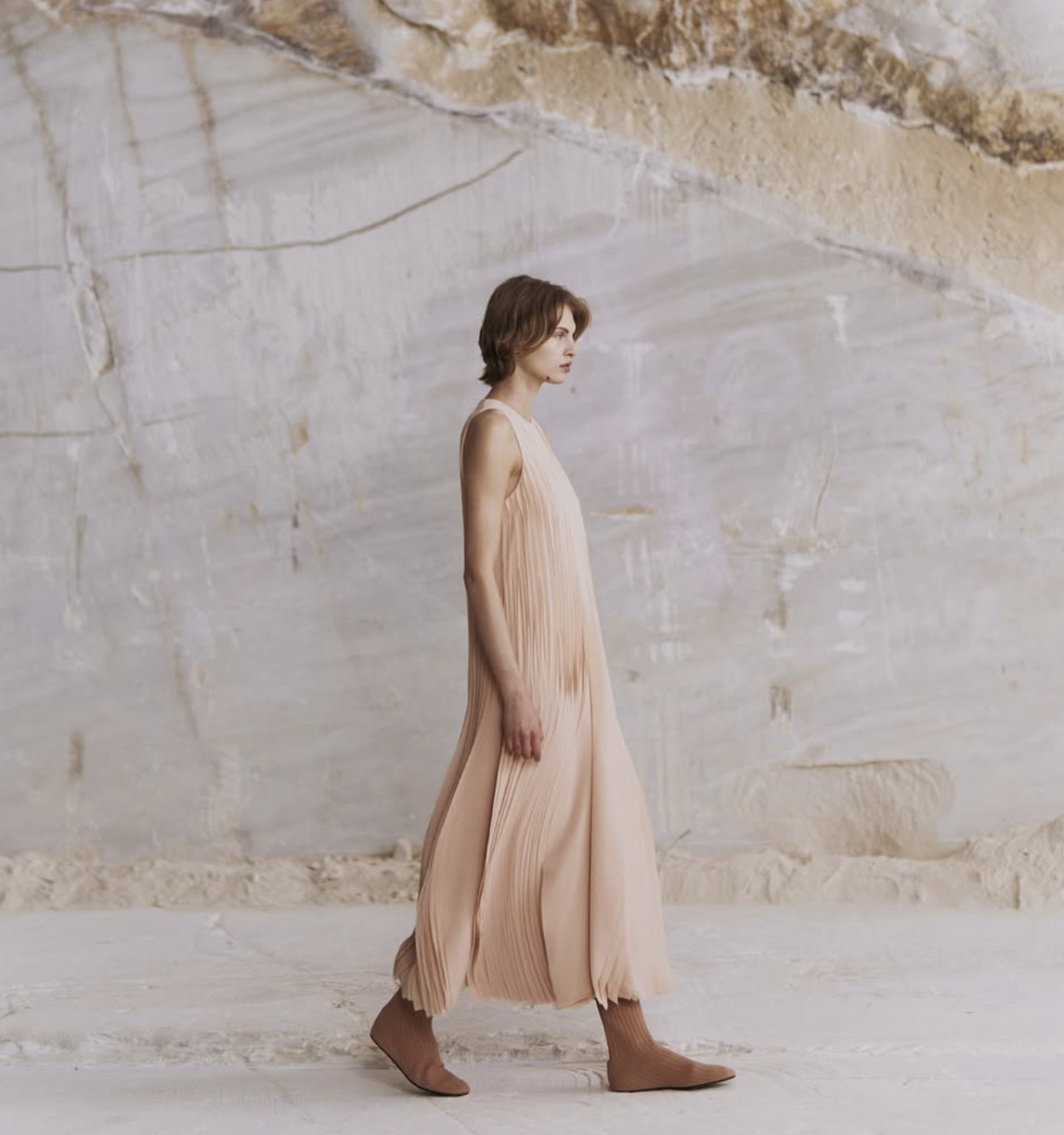 Это место с тысячелетней историей стало идеальной платформой для соединения древности и современности. Модели, спускаясь по стальной лестнице, растворялись в пещерообразном пространстве карьера, словно части живой инсталляции. Их образы передавали всю палитру мрамора: молочный, пыльно-голубой, терракотовый и глубокий синий — каждый оттенок олицетворял красоту самой природы.