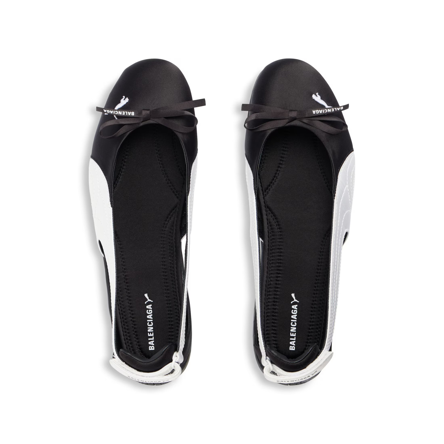 Вдохновленные спортивным архивом PUMA и радикальной подачей креативного директора французского Дома, эти балетки — не просто обувь. Это гибрид, балансирующий на грани между рейв-культурой и балетной школой, между уличной модой и haute couture. Блестящие, с изогнутой линией и минималистичным силуэтом, они представлены в четырех оттенках: пастельном розовом, голубом, черном и черно-белом.