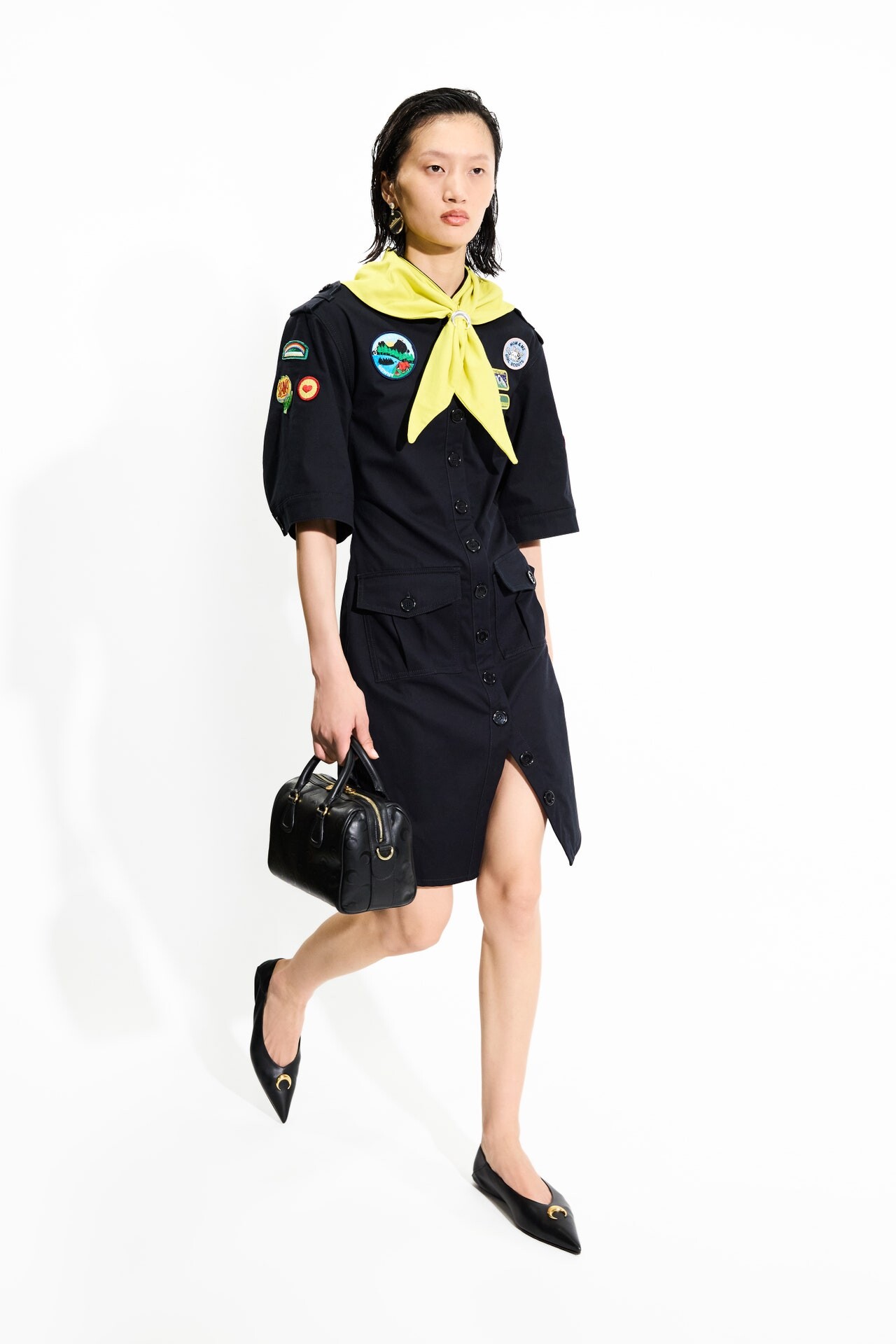 Коллекция SS '26 — это не о трендах, а о переосмыслении. О том, как хлопковый шопер, однажды забытый в супермаркете, может стать рубашкой, достойной карьерного переворота. Кимоно из винтажных шелковых платков? Да, и еще какие. Джинсы, собранные из нескольких «прошлых жизней», с кожаными языками пламени? Конечно. Береты, украшенные скаутскими нашивками, колье из игральных костей, серьги, словно распиленные вдоль морские раковины? И не только!